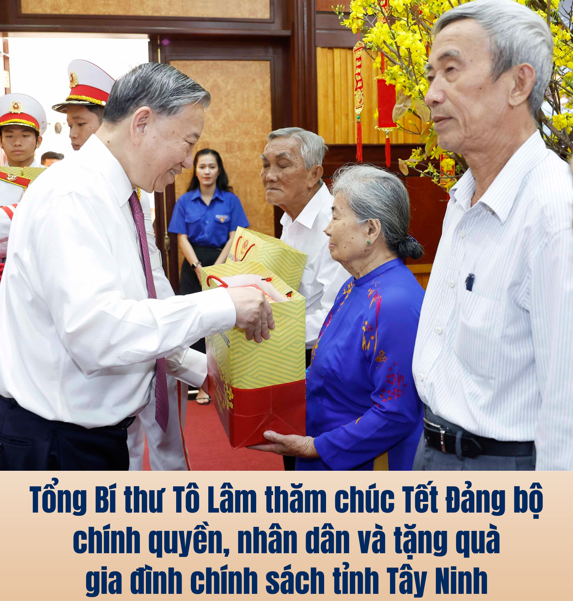 Nhân dịp đầu Xuân, đón Tết Nguyên đán Bính Ngọ, chiều 9/2/2026, Tổng Bí thư Tô Lâm thăm, chúc Tết Đảng bộ, chính quyền, nhân dân và tặng quà cho gia đình chính sách, người có công tiêu biểu tỉnh Tây Ninh.