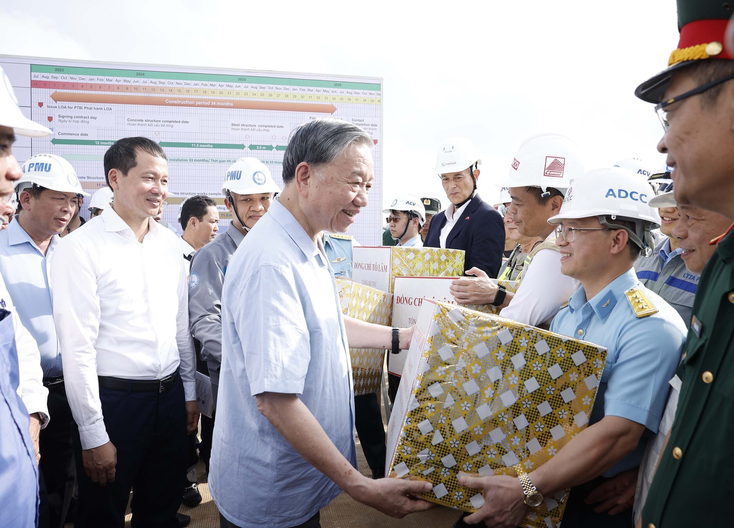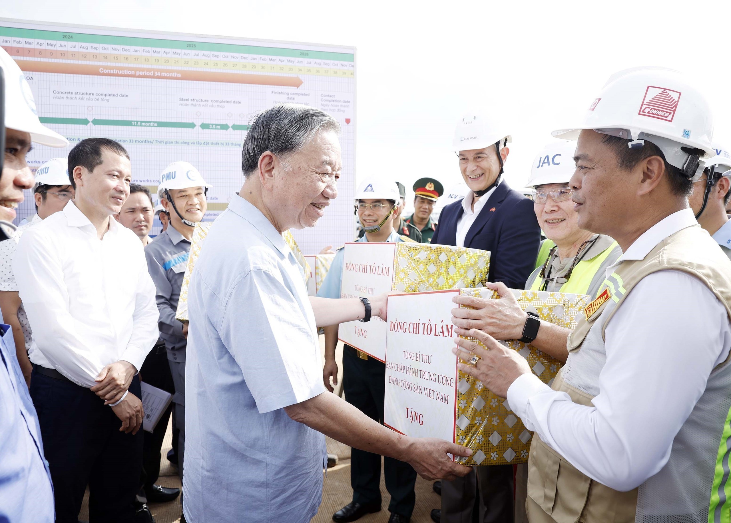 Tổng Bí thư Tô Lâm tặng quà cho các đơn vị thi công Dự án Cảng Hàng không quốc tế Long Thành. Ảnh: Thống Nhất – TTXVN
