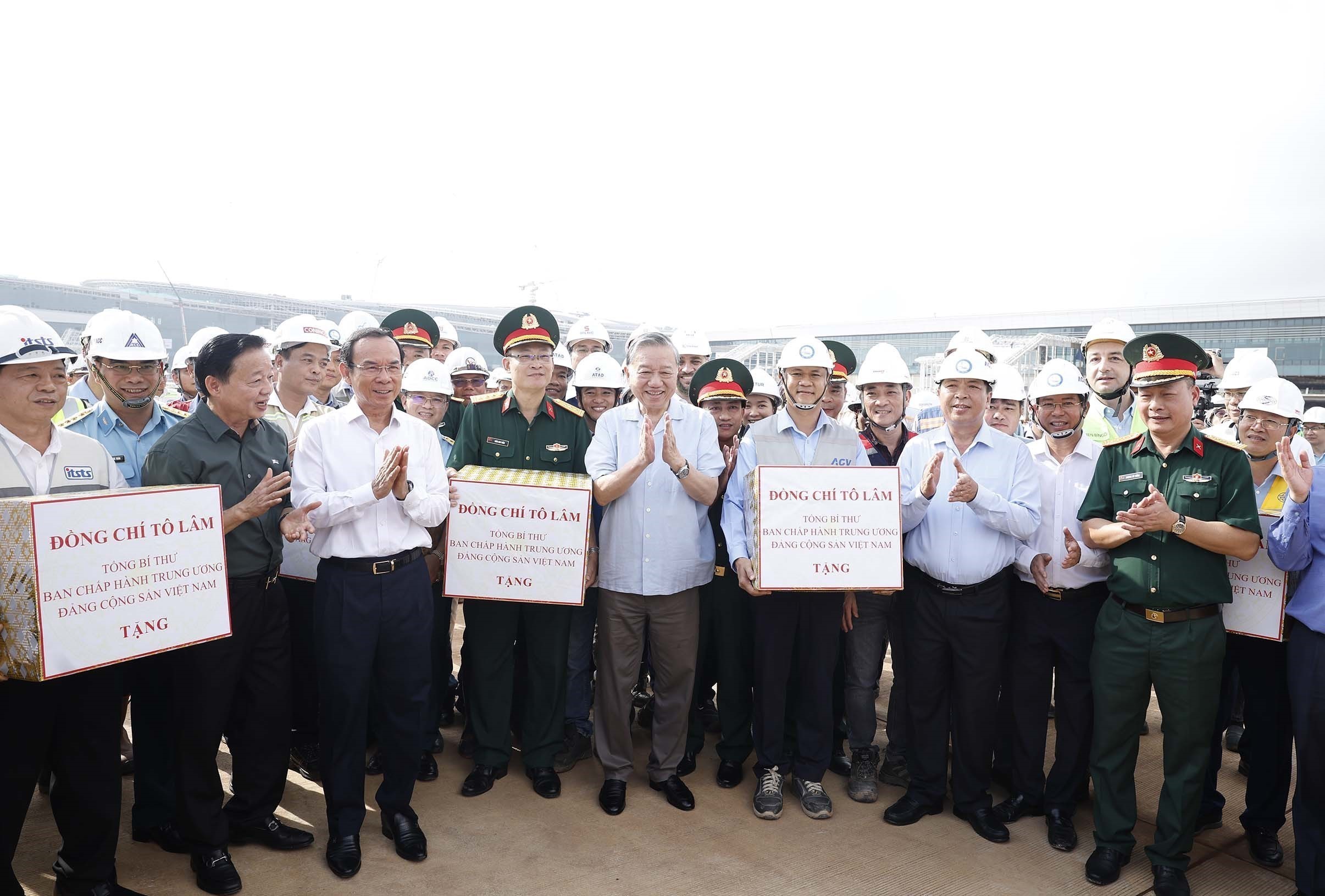 Tổng Bí thư Tô Lâm với cán bộ, công nhân, người lao động thi công Dự án Cảng Hàng không quốc tế Long Thành. Ảnh: Thống Nhất – TTXVN