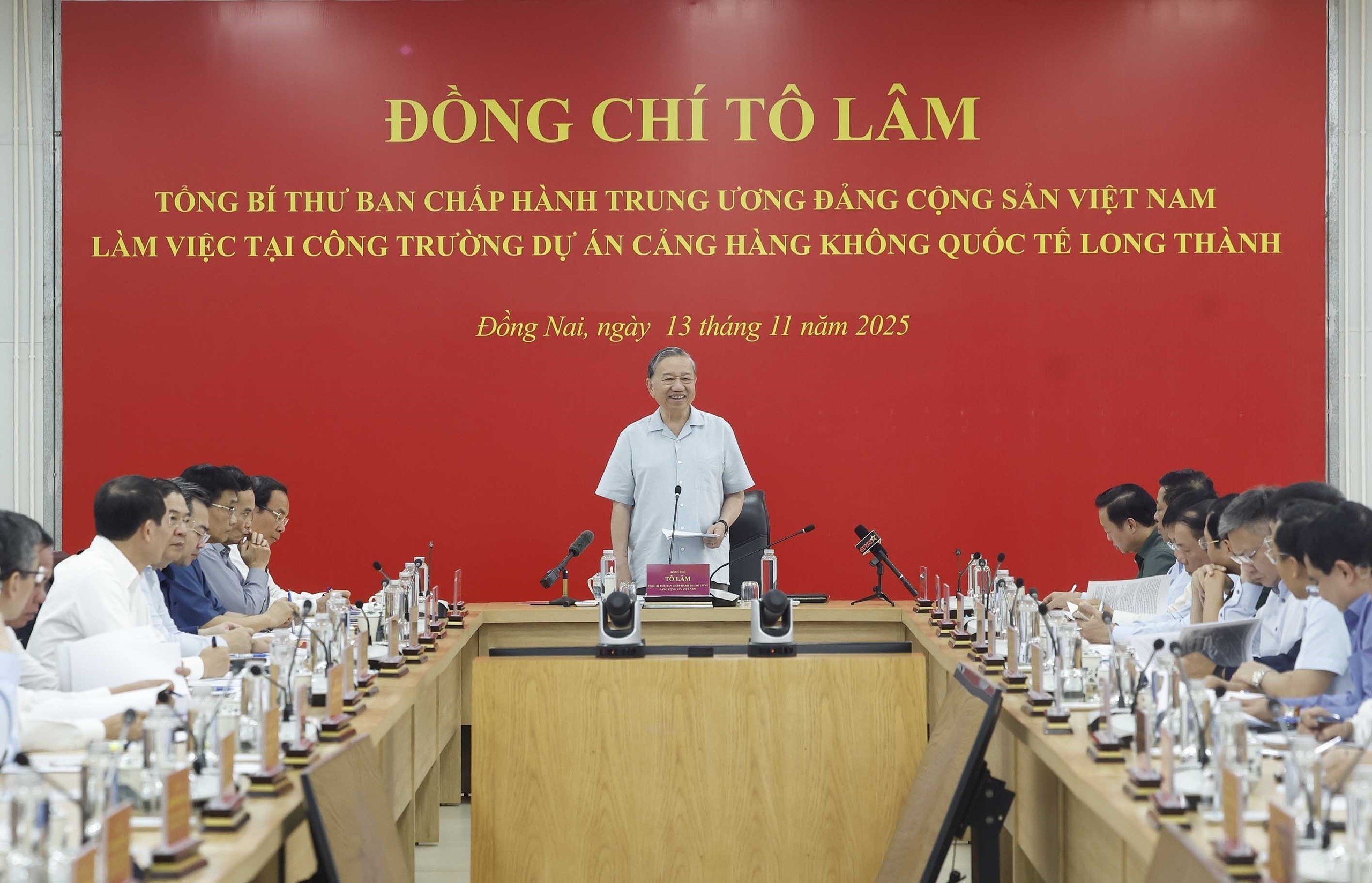 Sáng 13/11/2025, tại Đồng Nai, Tổng Bí thư Tô Lâm và Đoàn công tác Trung ương thăm, động viên cán bộ, công nhân, người lao động và chủ trì cuộc làm việc về tình hình thực hiện Dự án Cảng Hàng không quốc tế Long Thành, Đồng Nai.