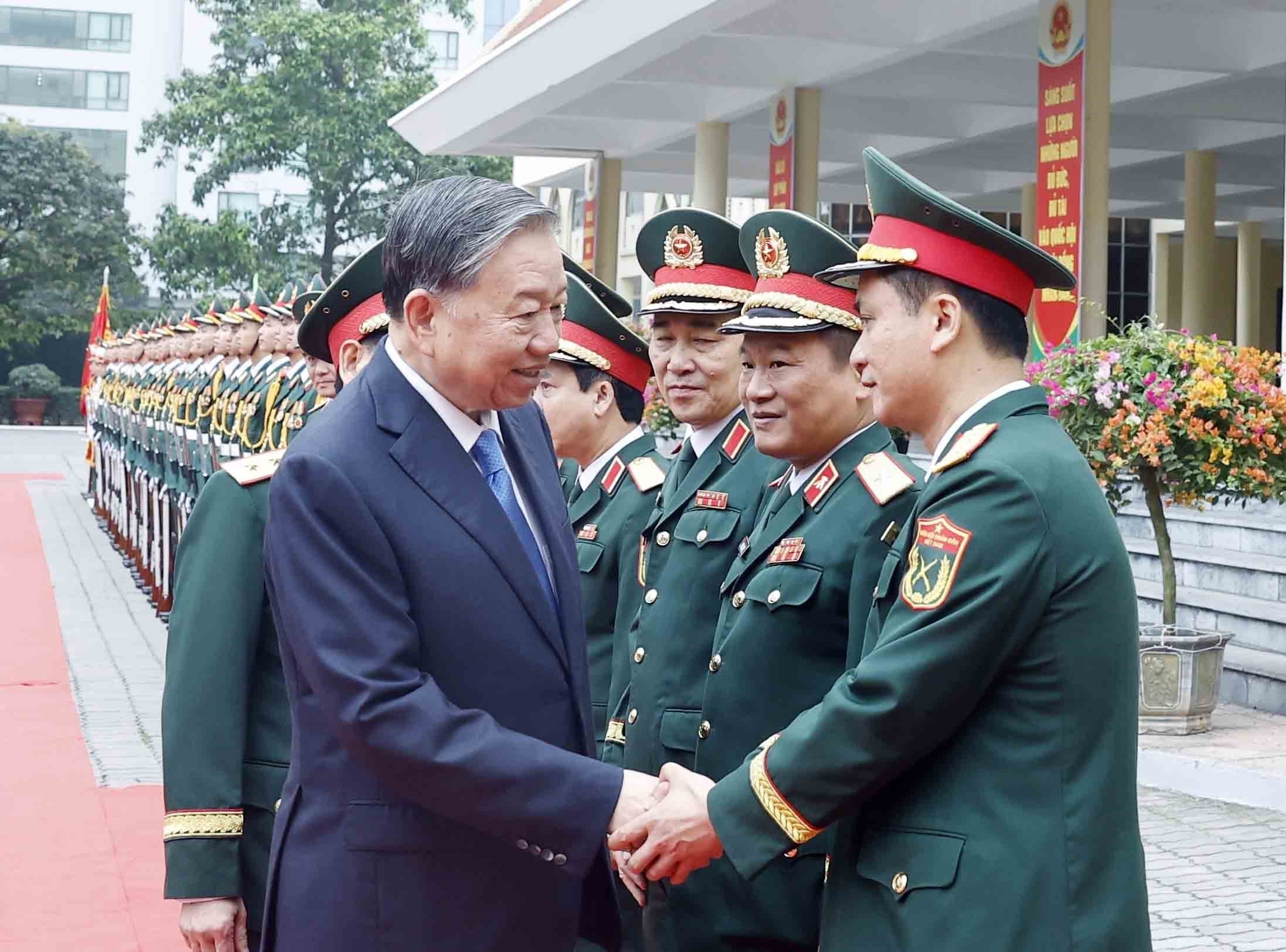 Phát biểu tại Học viện Kỹ thuật quân sự, thay mặt lãnh đạo Đảng, Nhà nước, Tổng Bí thư Tô Lâm chúc mừng, ghi nhận và biểu dương toàn thể cán bộ, giảng viên, nhân viên, học viên, sinh viên, chiến sĩ toàn Học viện về những kết quả, thành tích đã đạt được trong thời gian qua.