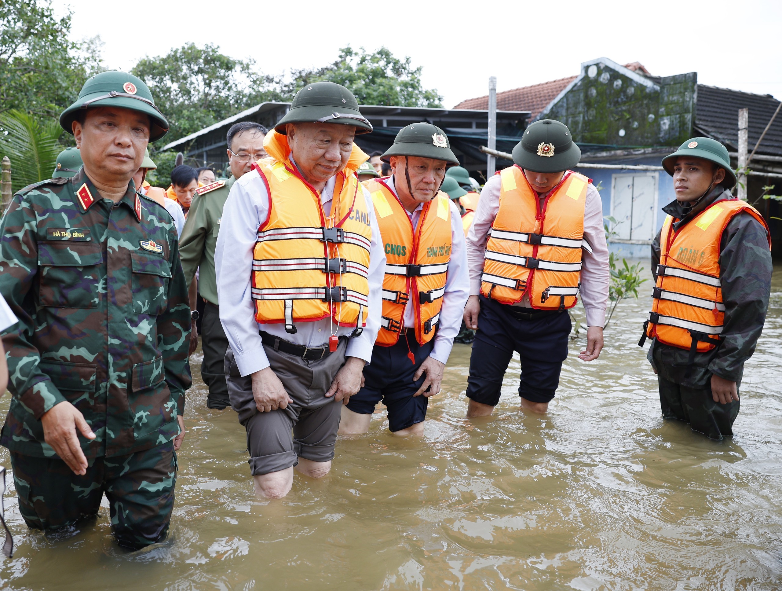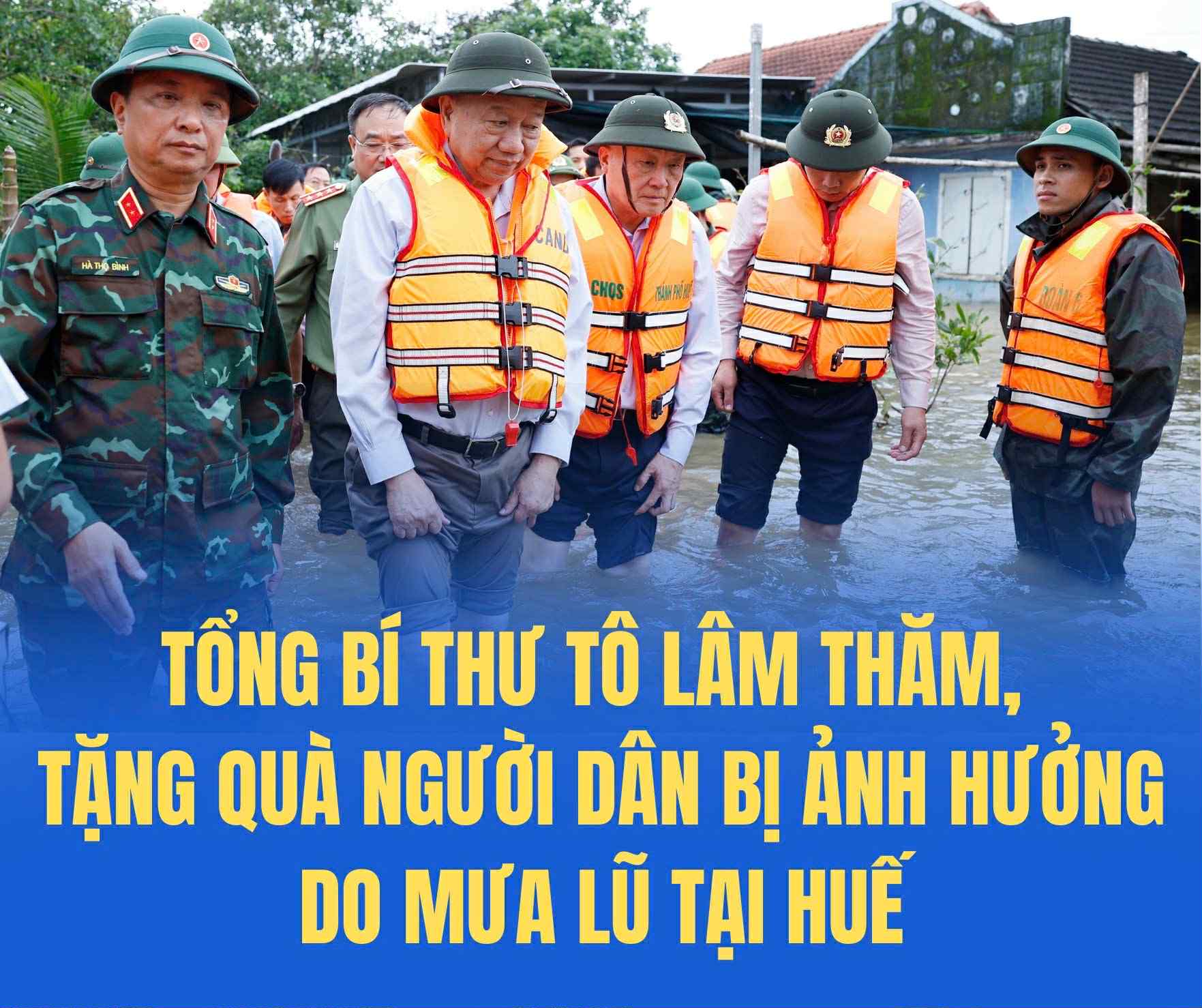 Tại xã Quảng Điền (thành phố Huế), Tổng Bí thư Tô Lâm đã đến thăm hỏi, động viên các gia đình thôn Khuông Phò Đông – địa bàn bị cô lập bởi mưa lũ trong những ngày qua. Tại đây, Tổng Bí thư thăm hỏi ân cần, chia sẻ sâu sắc trước những thiệt hại, mất mát do mưa lũ gây ra và mong người dân vượt qua khó khăn, sớm ổn định cuộc sống.