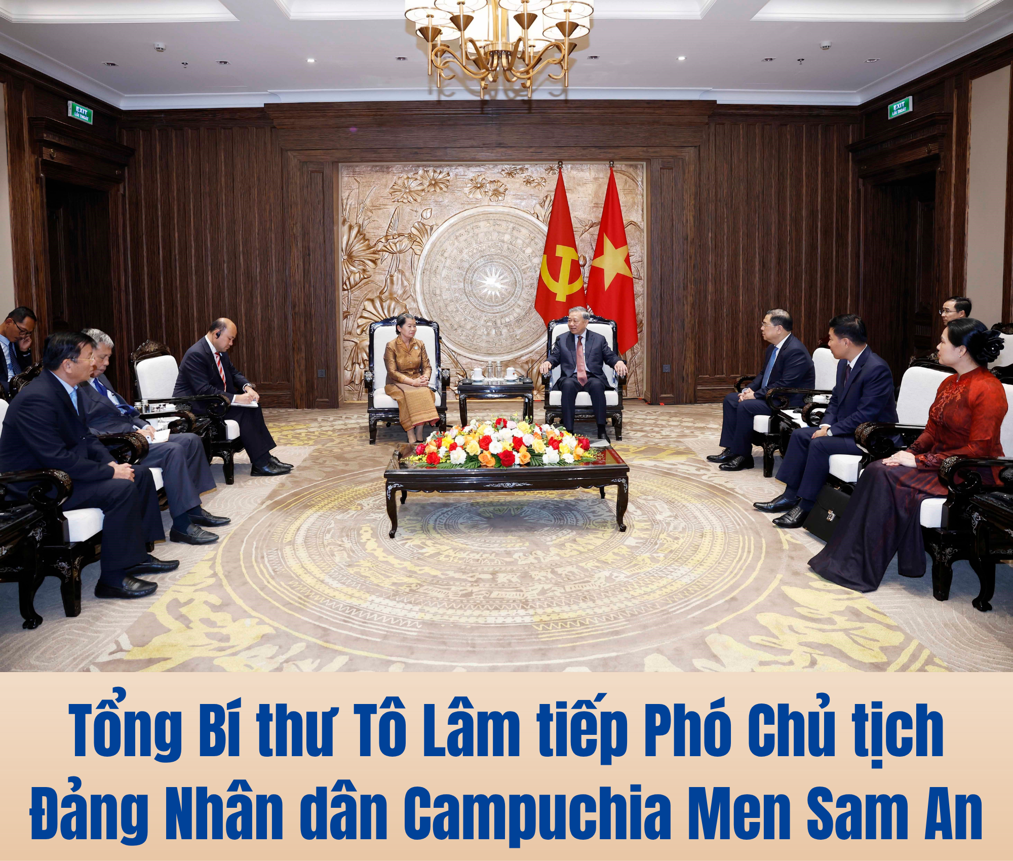 Chiều 23/3/2026, tại Hà Nội, Tổng Bí thư Tô Lâm tiếp bà Men Sam An, Phó Chủ tịch Đảng Nhân dân Campuchia, Chủ tịch Hội đồng Quốc gia Mặt trận Đoàn kết Phát triển Tổ quốc Campuchia.