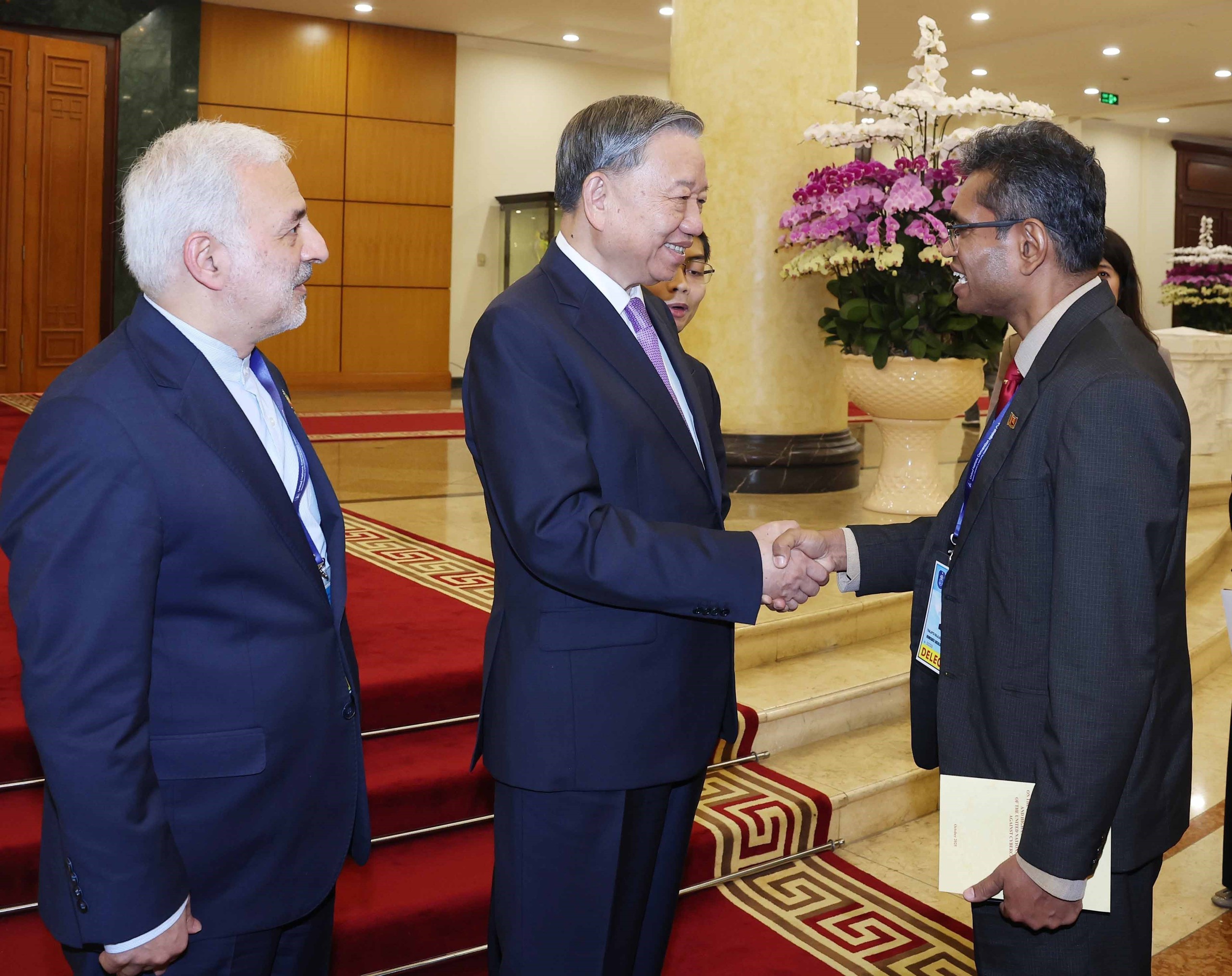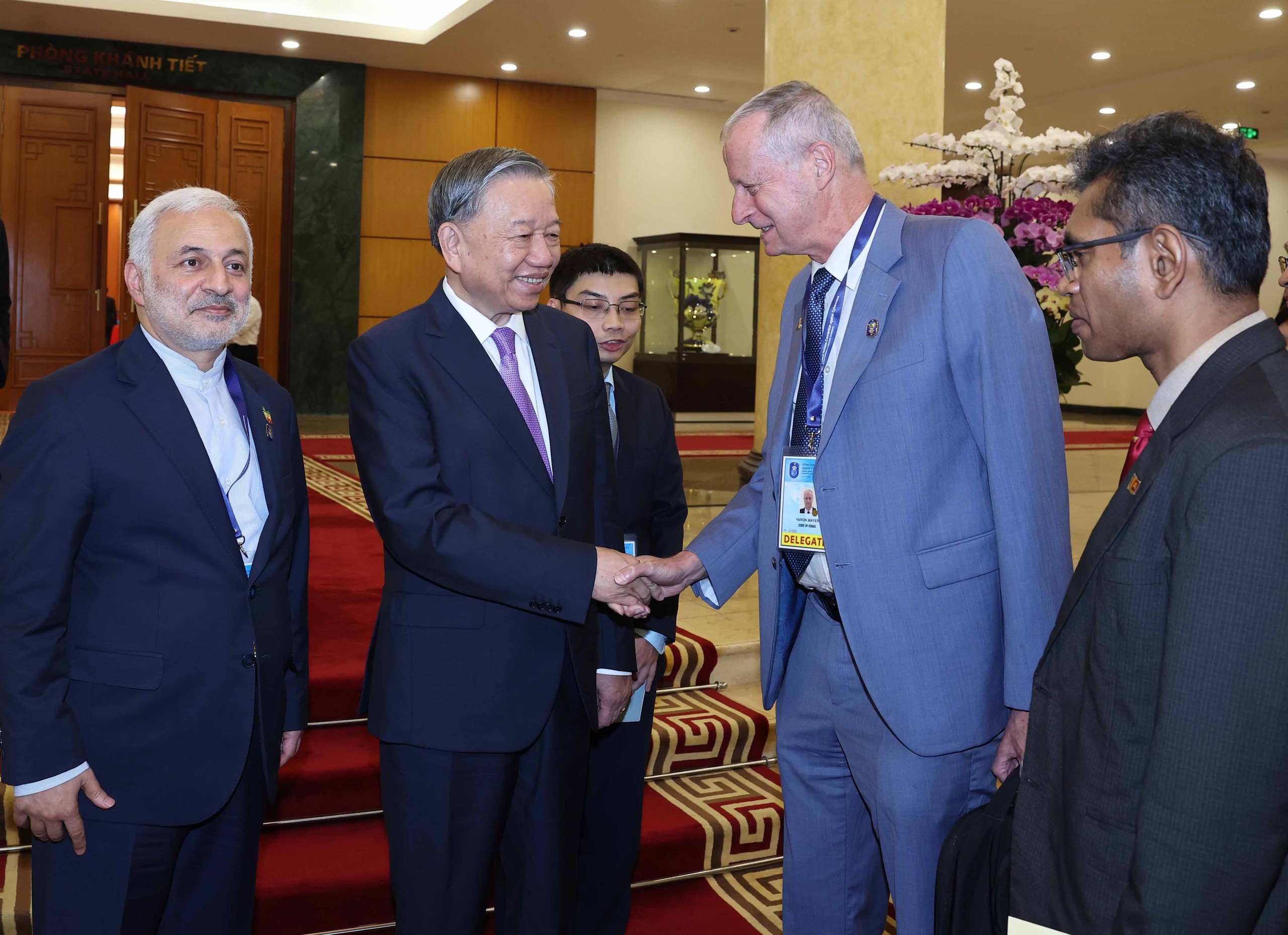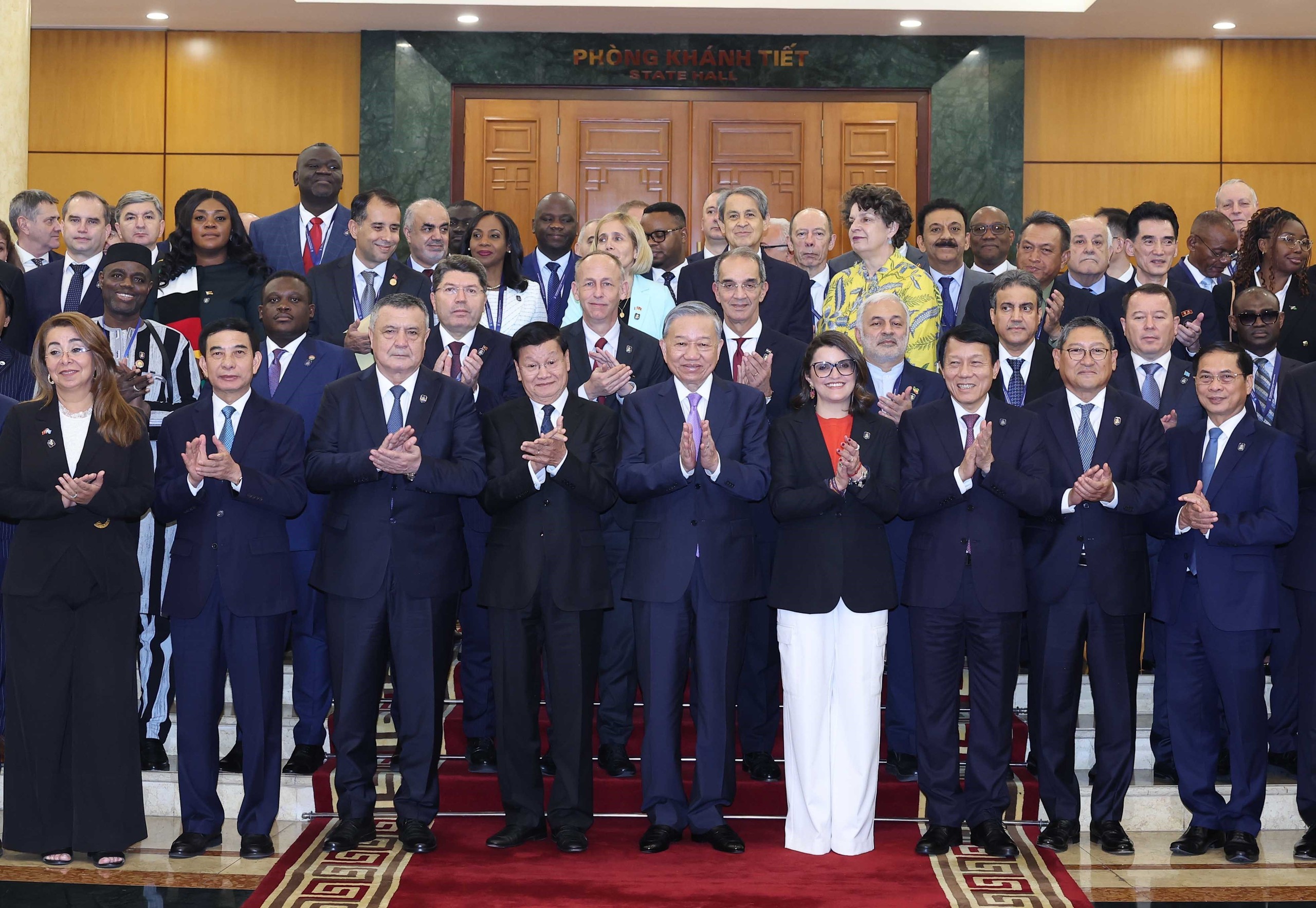 Tại buổi tiếp, Tổng Bí thư Tô Lâm nhấn mạnh sự tham dự của đại diện các quốc gia và các tổ chức quốc tế tại sự kiện có ý nghĩa toàn cầu này là minh chứng sống động cho tinh thần đoàn kết quốc tế để cùng đối phó với một thách thức chung của nhân loại và cũng khẳng định mối quan hệ hữu nghị và hợp tác bền chặt giữa Việt Nam và các quốc gia, các dân tộc trên thế giới.