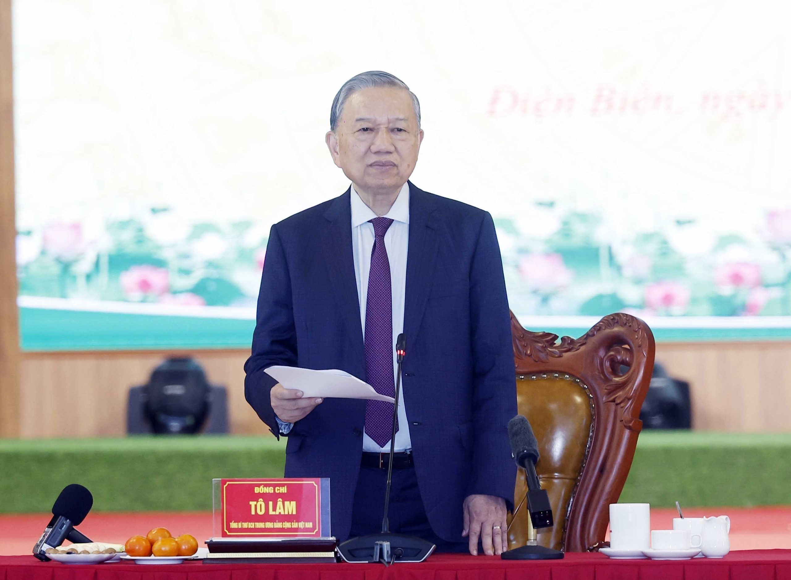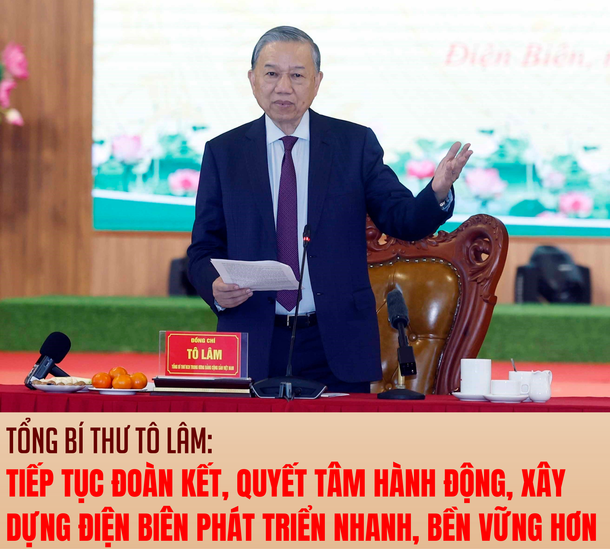 Điện Biên đang đứng trước những thời cơ và thách thức đan xen. Tổng Bí thư đề nghị, trong giai đoạn tới, tỉnh cần kiện toàn, nâng cao năng lực hoạt động của cán bộ cấp xã, có trình độ, có khả năng ứng dụng khoa học kỹ thuật, công nghệ, nhiệt huyết, trách nhiệm. Việc thực hiện chính quyền địa phương hai cấp phải được triển khai nghiêm túc, để nhân dân cảm nhận được sự chuyển biến của chính quyền địa phương thực sự gần dân, sát với dân, giải quyết mọi yêu cầu của dân. Mọi chủ trương, đường lối, nghị quyết của Đảng phải được triển khai ở cấp cơ sở, cấp chi bộ, đảng bộ, cấp xã, cấp tỉnh.