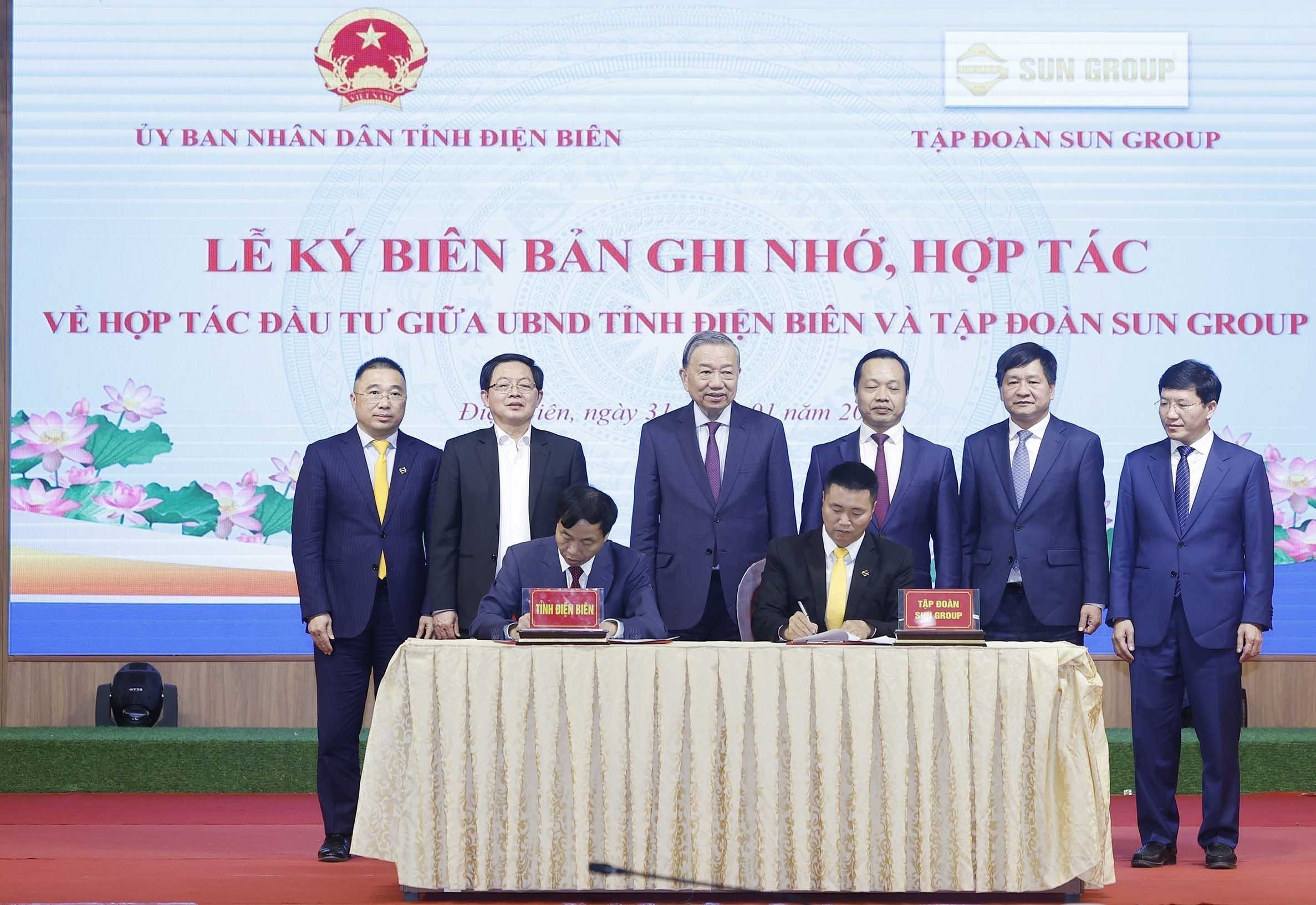 Tổng Bí thư Tô Lâm chứng kiến lễ ký biên bản hợp tác giữa UBND tỉnh Điện Biên và Tập đoàn Sun Group. Ảnh: Thống Nhất – TTXVN