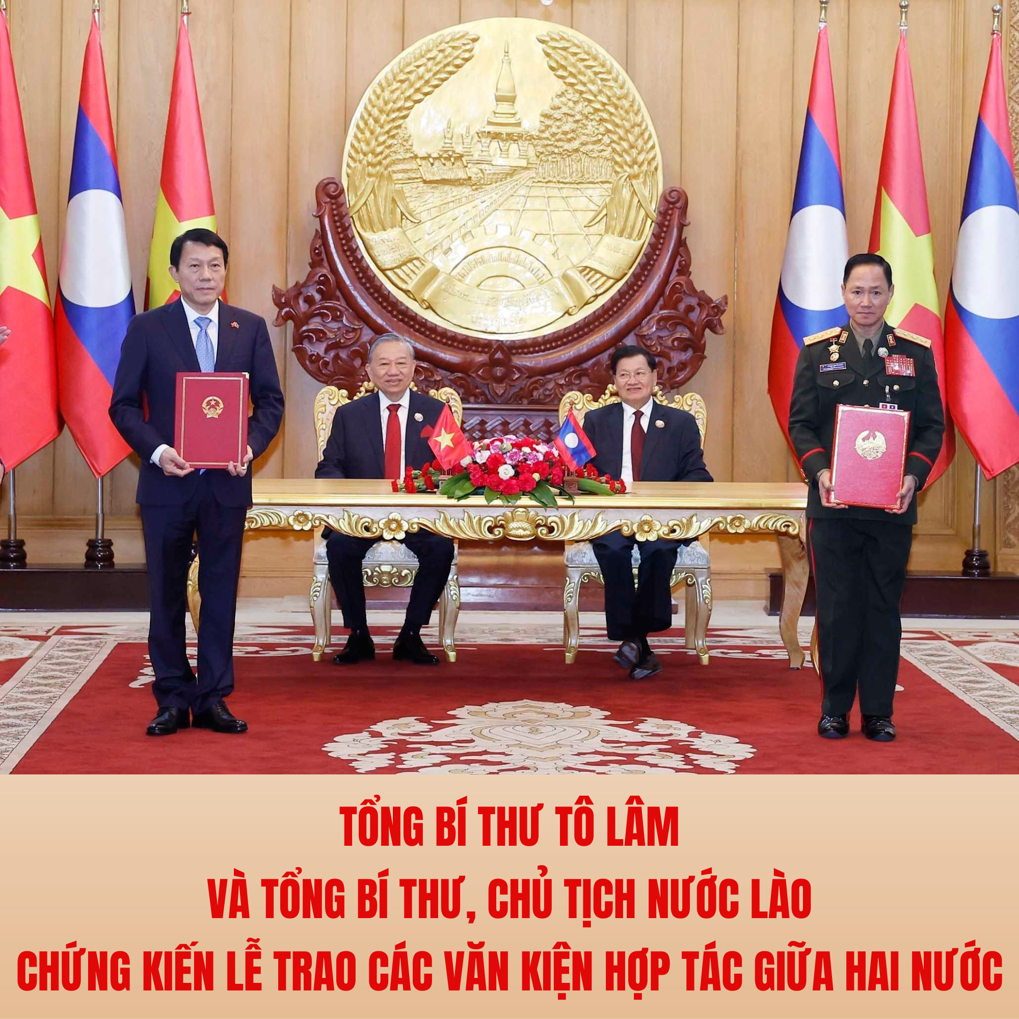 Trong khuôn khổ chuyến thăm cấp Nhà nước Cộng hòa Dân chủ Nhân dân Lào, dự Lễ kỷ niệm 50 năm Quốc khánh nước Cộng hòa Dân chủ Nhân dân Lào và đồng chủ trì Cuộc gặp cấp cao giữa Đảng Cộng sản Việt Nam và Đảng Nhân dân Cách mạng Lào, trưa 1/12, ngay sau hội đàm, Tổng Bí thư Tô Lâm và Tổng Bí thư, Chủ tịch nước Lào Thongloun Sisoulith cùng Đoàn đại biểu cấp cao hai nước chứng kiến Lễ trao các văn kiện hợp tác.