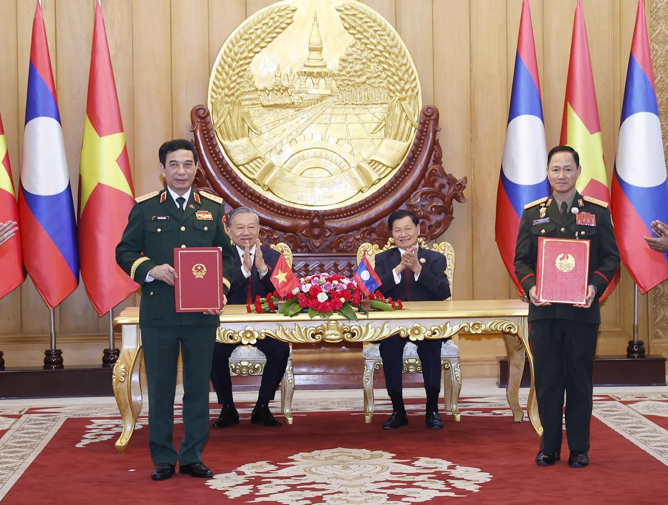 Tổng Bí thư Tô Lâm và Tổng Bí thư, Chủ tịch nước Lào Thongloun Sisoulith chứng kiến trao Kế hoạch hợp tác năm 2026 giữa Bộ Quốc phòng Việt Nam và Bộ Quốc phòng Lào. Ảnh: Thống Nhất - TTXVN