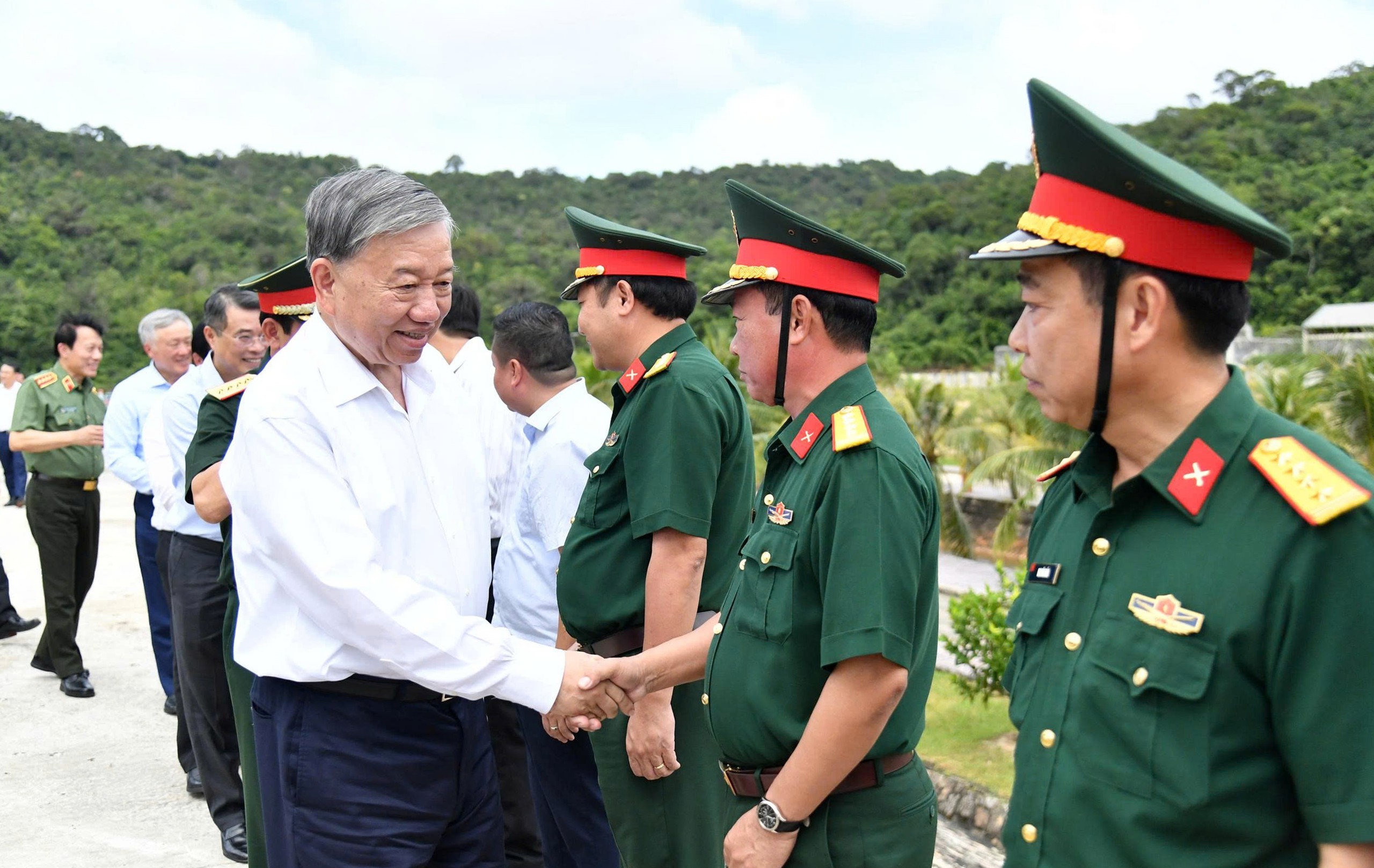 Tổng Bí thư Tô Lâm với cán bộ chiến sĩ làm nhiệm vụ tại đặc khu Thổ Châu, tỉnh An Giang. Ảnh: Văn Sĩ - TTXVN