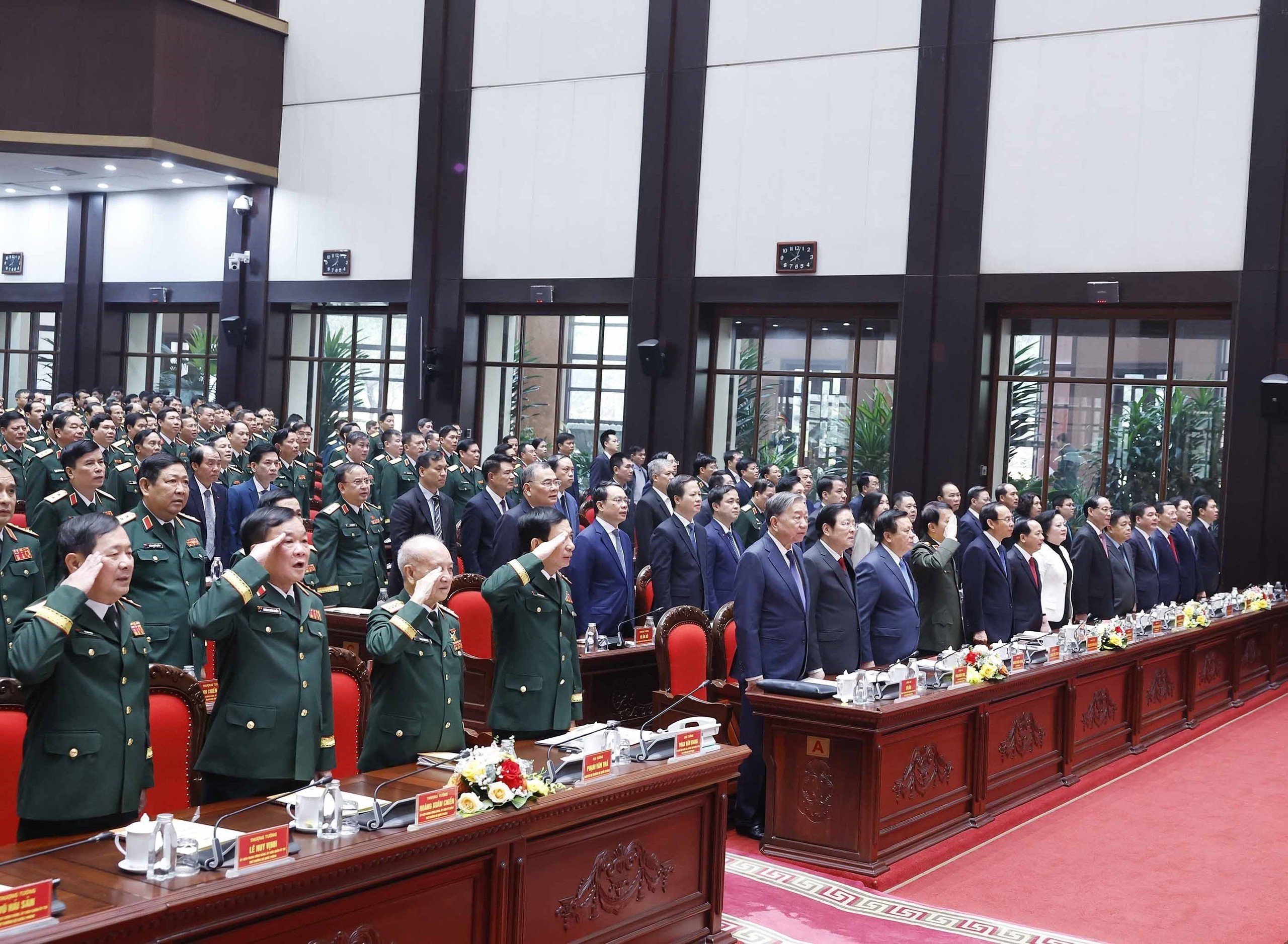 Tổng Bí thư Tô Lâm và các đại biểu thực hiện nghi lễ chào cờ. Ảnh: Thống Nhất – TTXVN