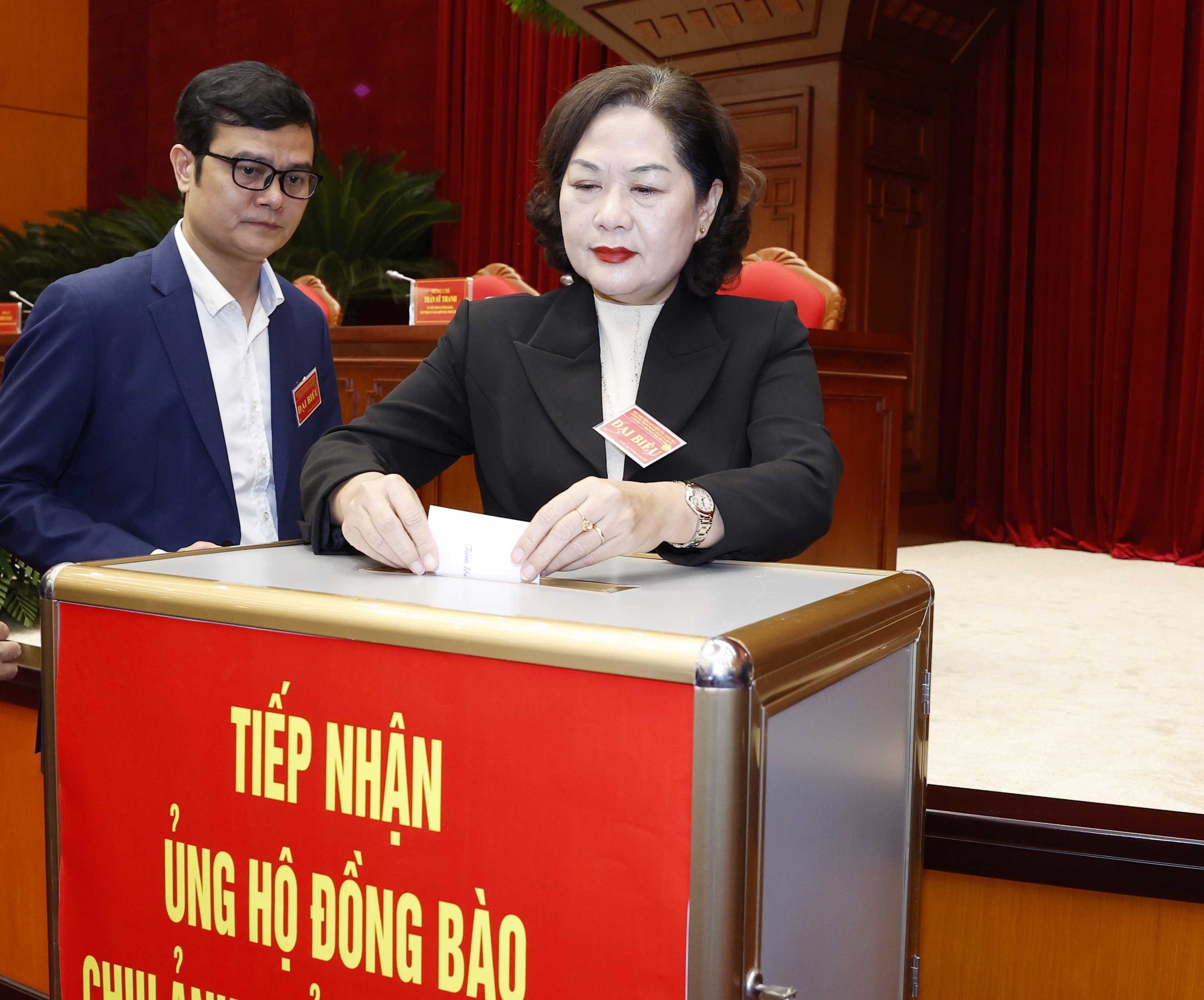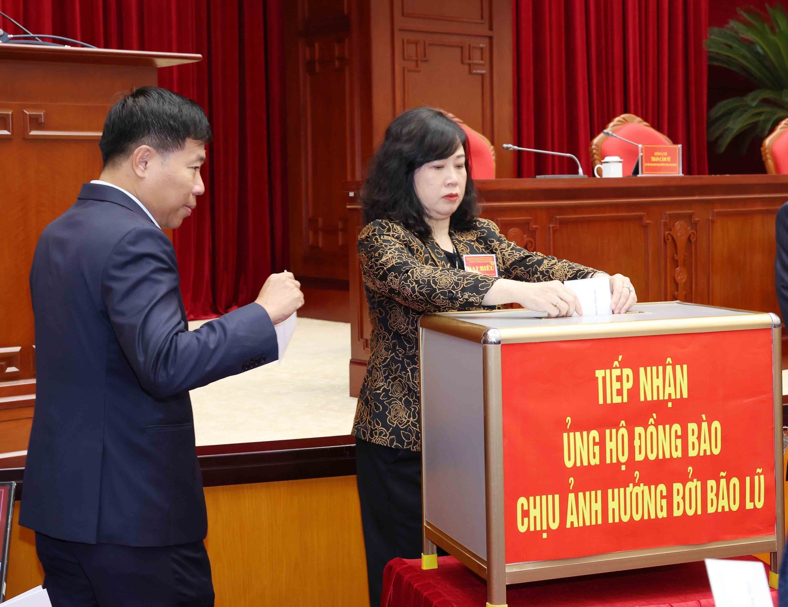 Đồng chí Trần Cẩm Tú, Uỷ viên Bộ Chính trị, Thường trực Ban Bí thư quyên góp ủng hộ đồng bào chịu ảnh hưởng của lũ lụt. Ảnh: Phương Hoa - TTXVN