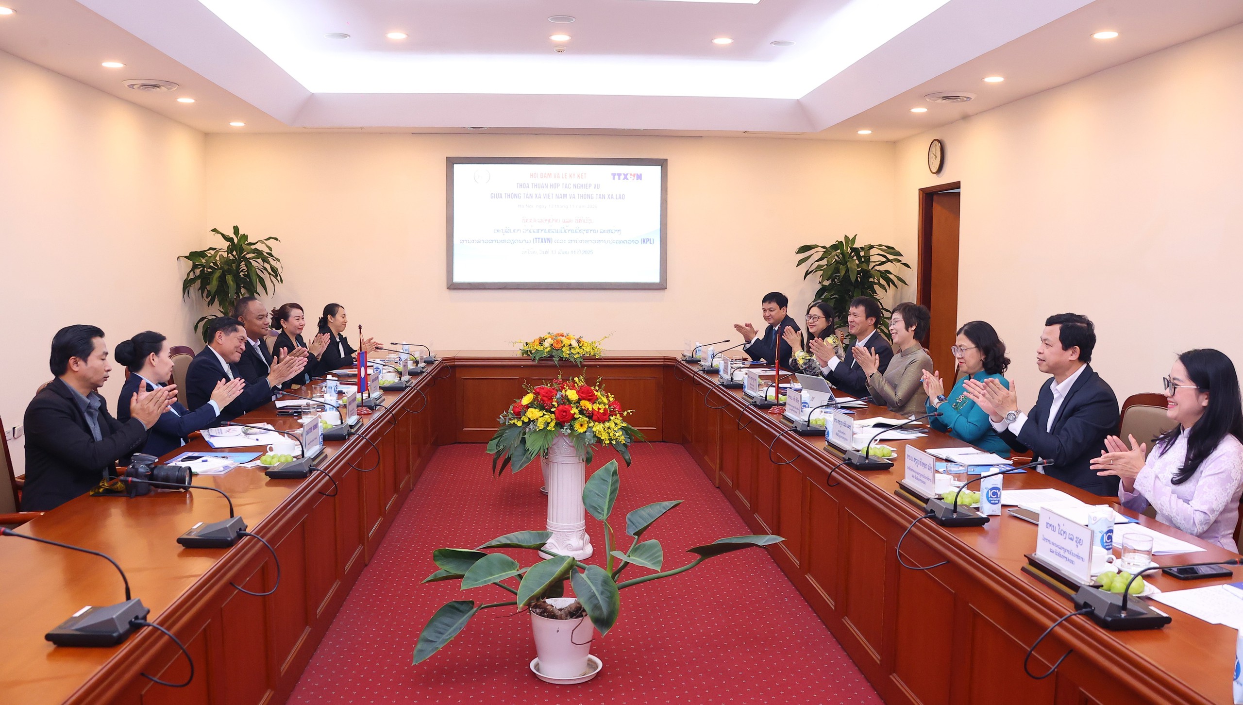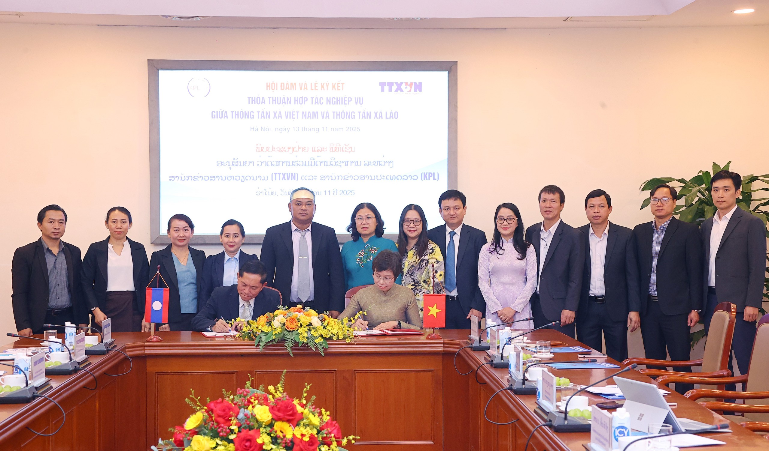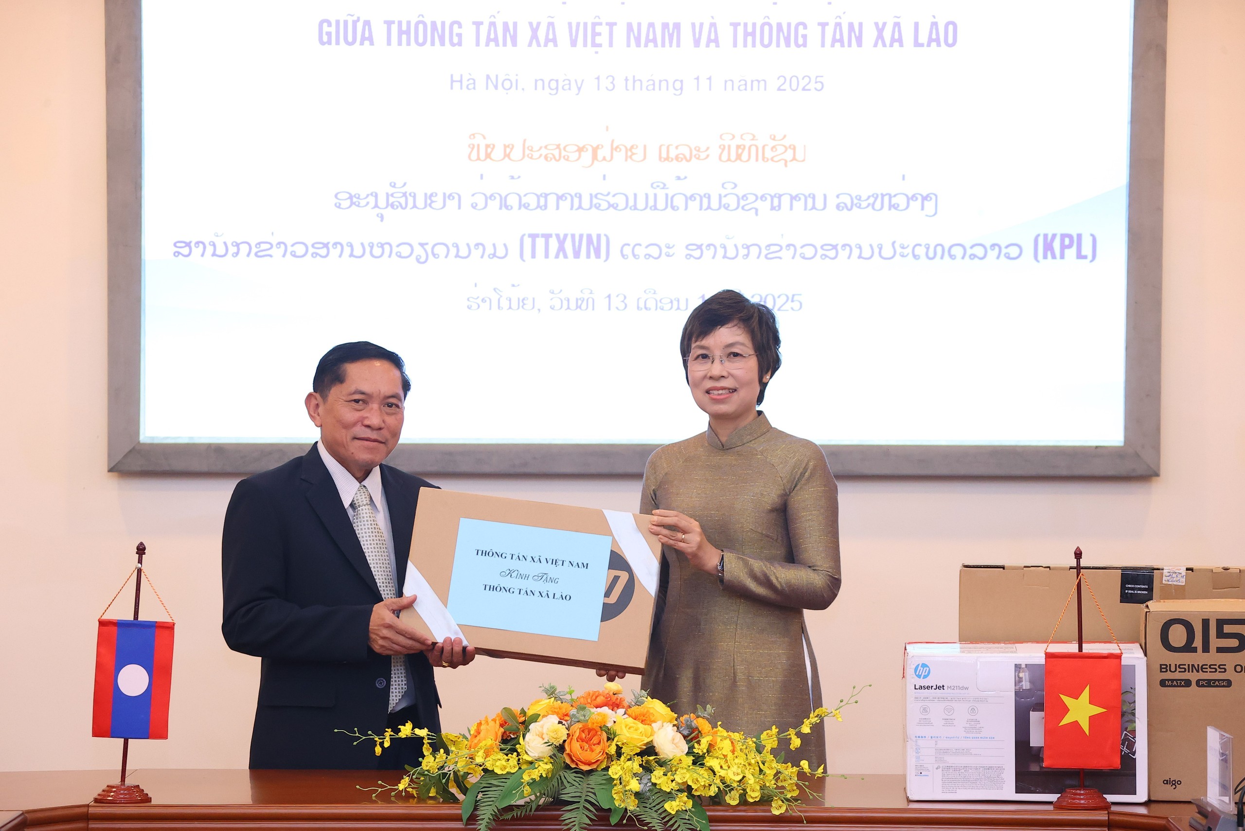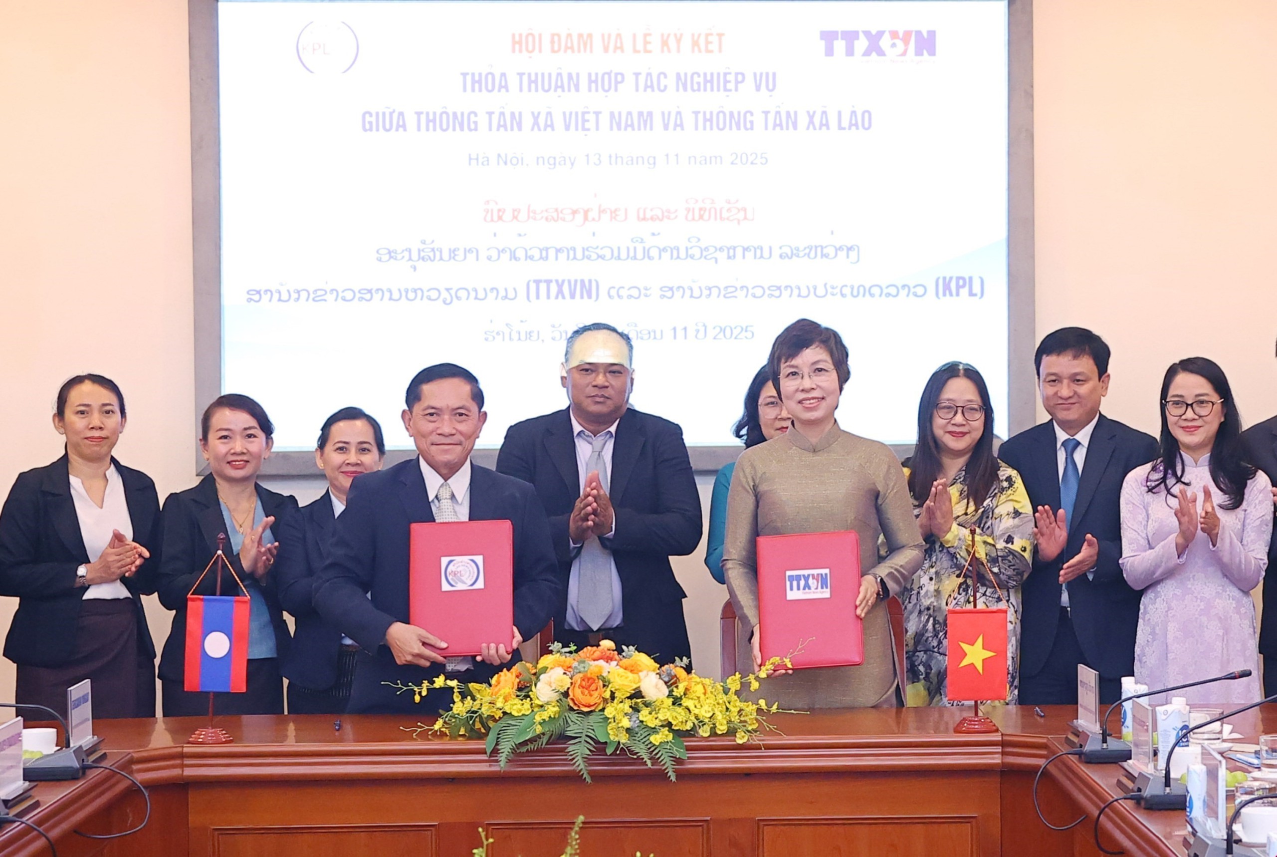 Sáng 13/11/2025, tại Trung tâm Thông tấn Quốc gia, số 5 Lý Thường Kiệt (Hà Nội), Tổng Giám đốc Thông tấn xã Việt Nam (TTXVN) Vũ Việt Trang hội đàm với Tổng Giám đốc Thông tấn xã Pathet Lào (KPL) Vannasin Simmavong.