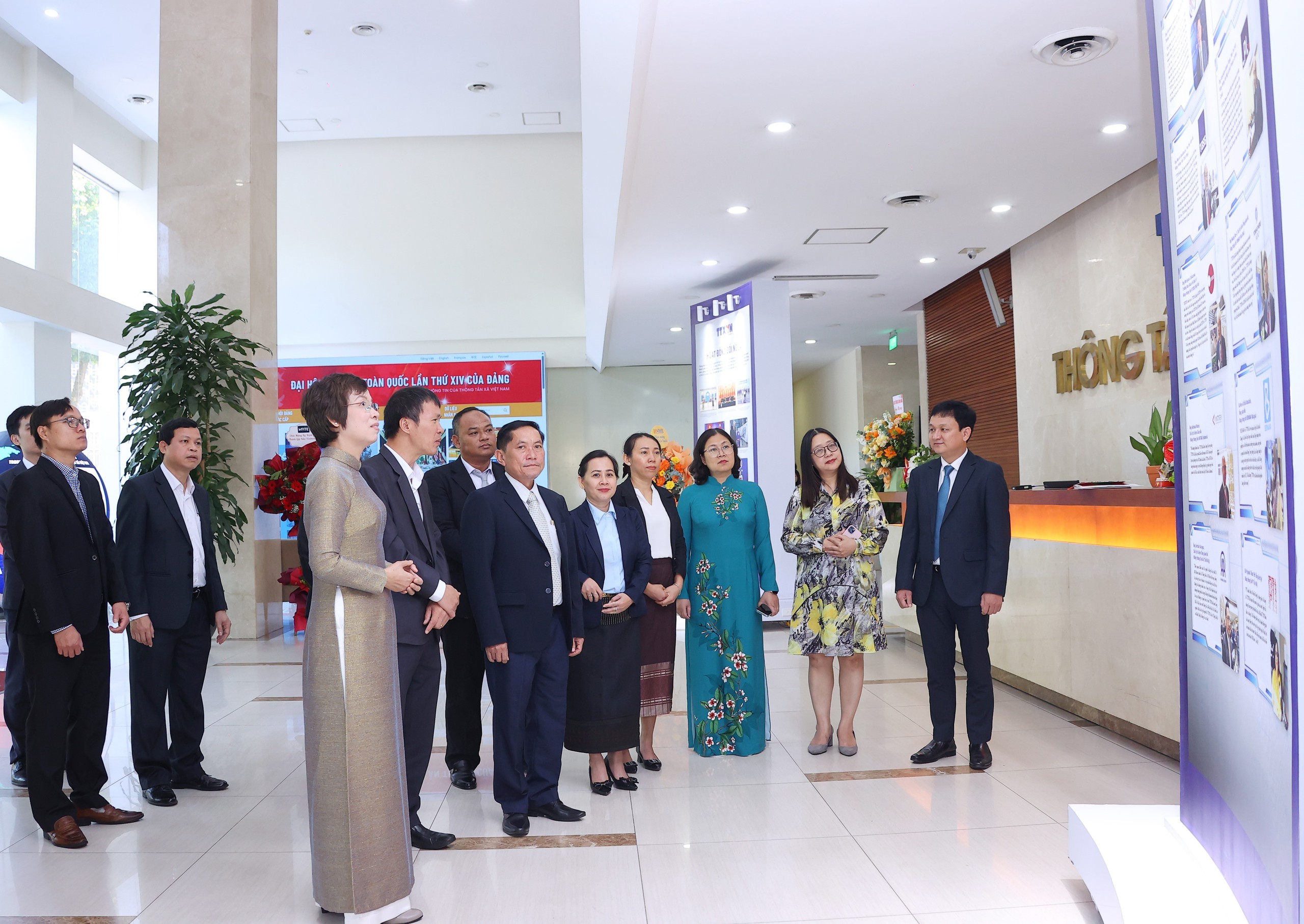 Tổng Giám đốc Thông tấn xã Việt Nam Vũ Việt Trang và Tổng Giám đốc Thông tấn xã Pathet Lào Vannasin Simmavong với các đại biểu tham quan các ấn phẩm điện tử của TTXVN. Ảnh: Văn Điệp – TTXVN