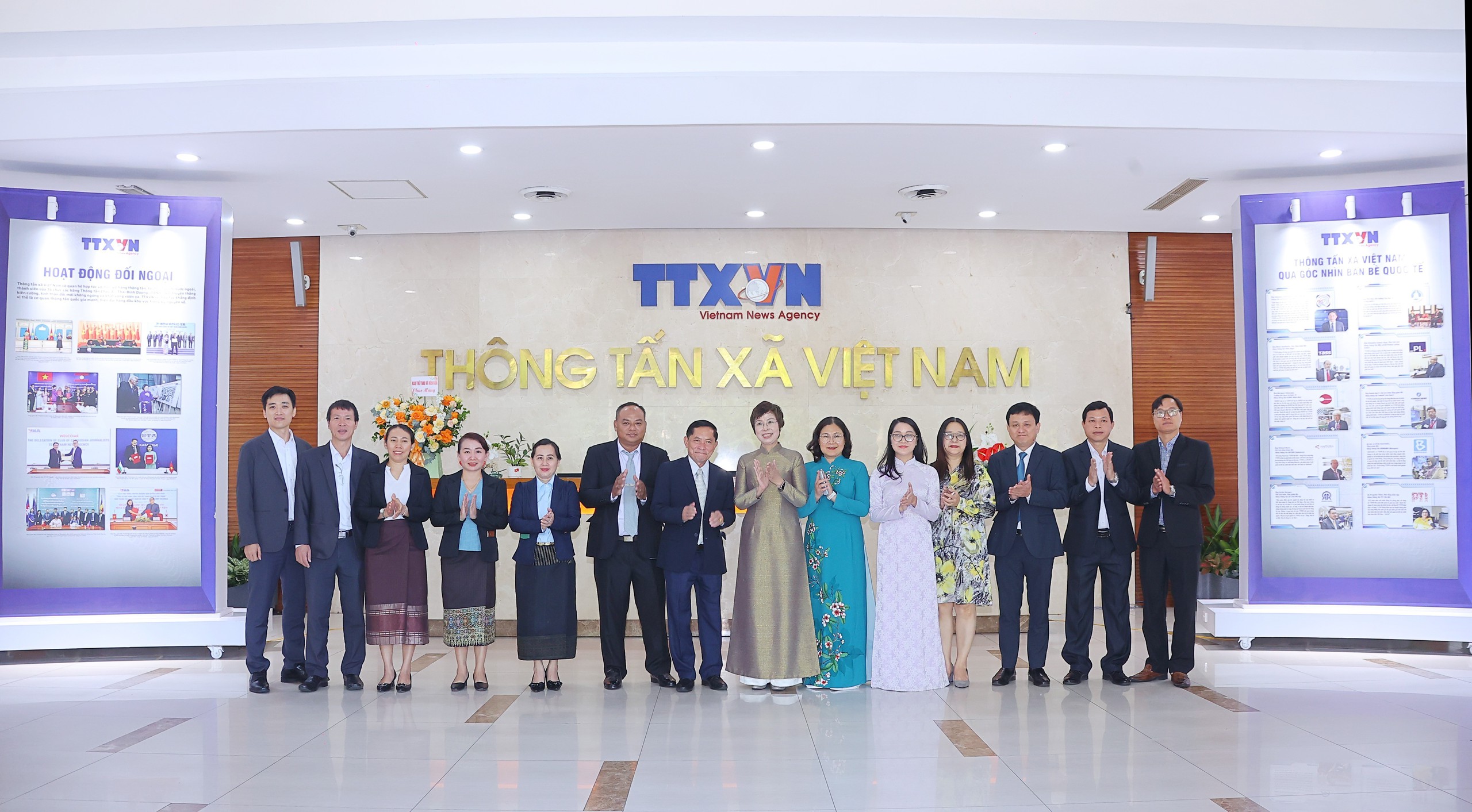 Tổng Giám đốc Thông tấn xã Việt Nam Vũ Việt Trang và Tổng Giám đốc Thông tấn xã Pathet Lào Vannasin Simmavong với các đại biểu. Ảnh: Văn Điệp – TTXVN