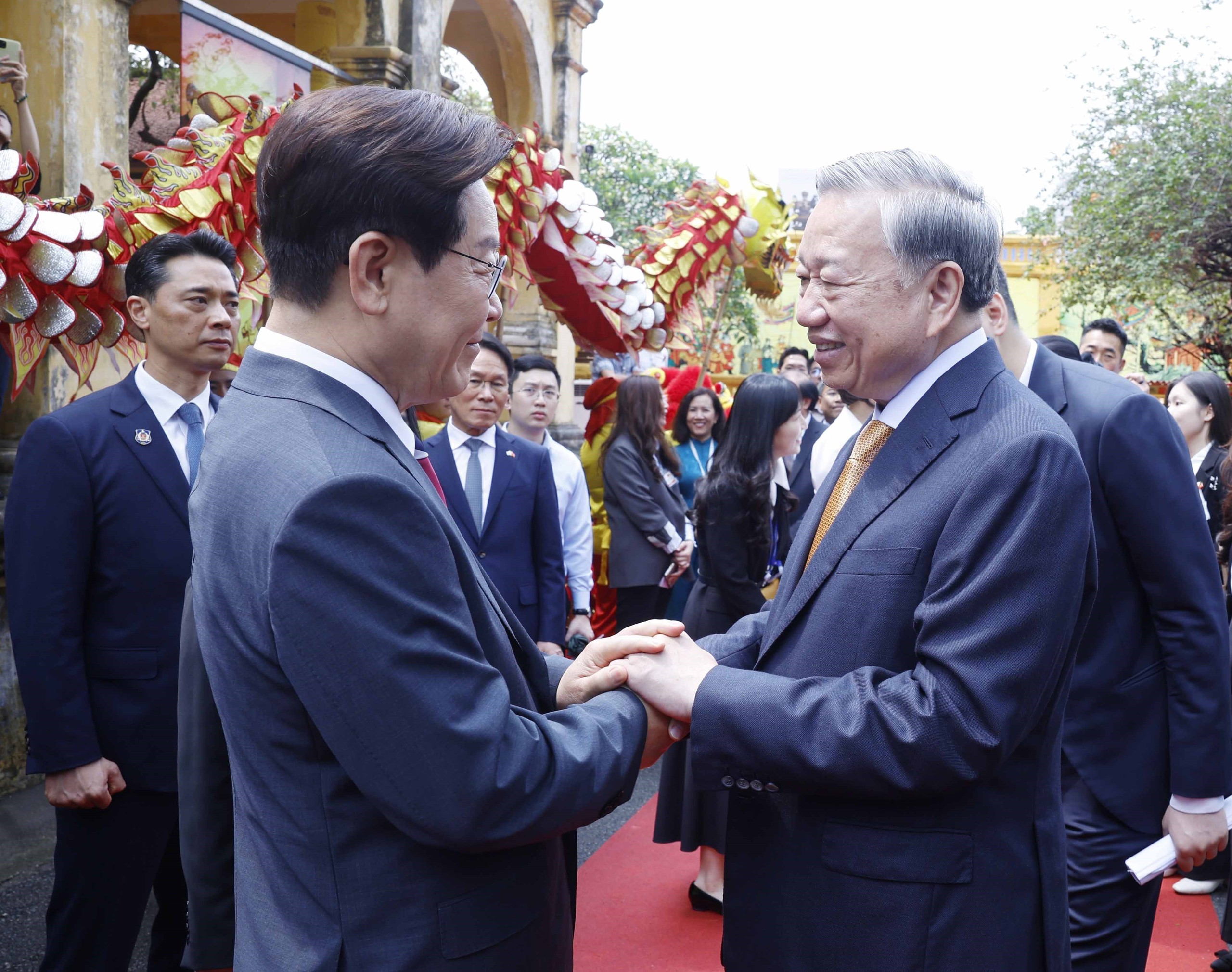 Trong khuôn khổ chuyến thăm, Tổng Bí thư, Chủ tịch nước Tô Lâm và Phu nhân đã chủ trì Chương trình hữu nghị đặc biệt tại Hoàng Thành Thăng Long chào mừng chuyến thăm cấp Nhà nước tới Việt Nam của Tổng thống Lee Jae Myung và Phu nhân.
