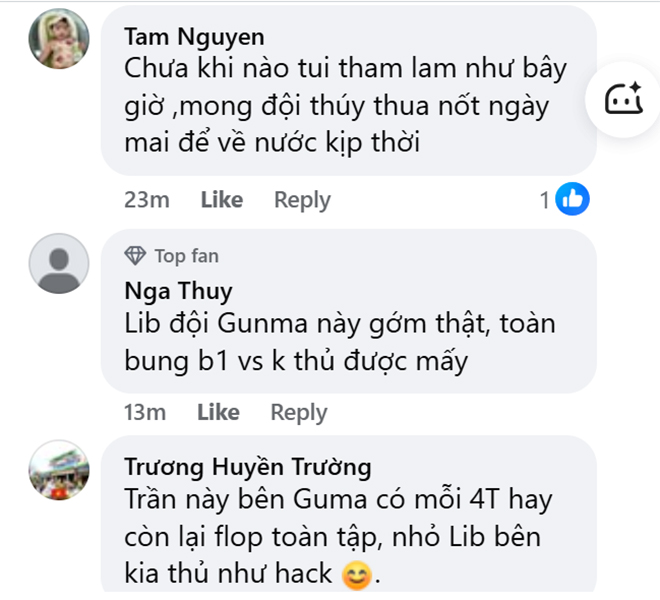 Đáng chú ý, sau trận đấu, nhiều người hâm mộ Việt Nam đã để lại bình luận trên mạng xã hội, bày tỏ mong muốn Thanh Thúy sớm trở về nước để hỗ trợ VTV Bình Điền Long An. Không ít ý kiến hài hước cho rằng "chỉ cần Gunma thua thêm một trận nữa" để chủ công số một Việt Nam kịp quay lại "gánh team" tại giải quốc nội.