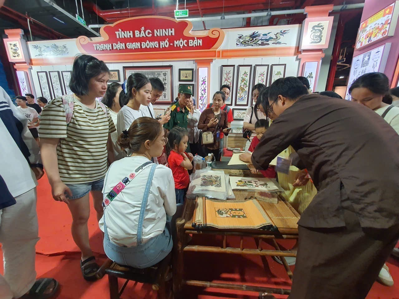 Người dân tới trải nghiệm ở gian trưng bày tranh dân gian Đông Hồ trong Triển lãm thành tựu đất nước “80 năm hành trình Độc lập - Tự do - Hạnh phúc”