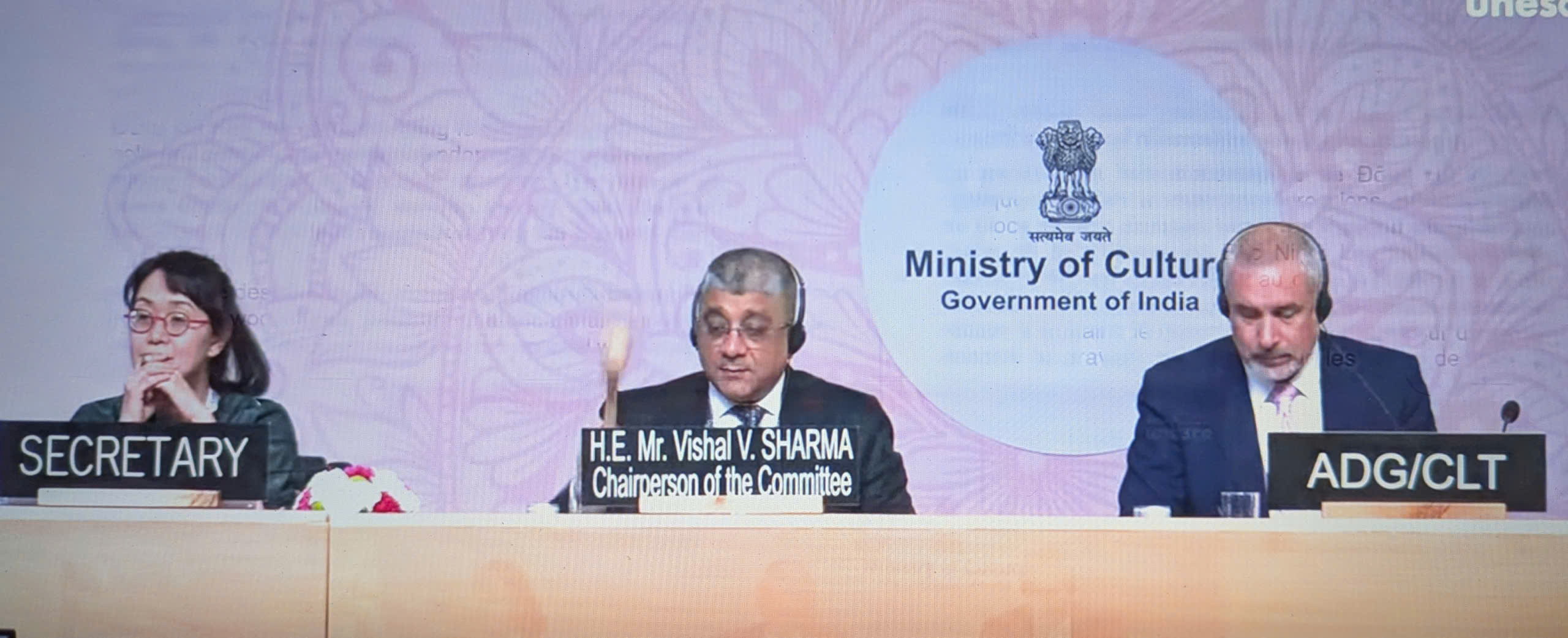 Ông Vishal V. Sharma (giữa), Chủ tịch Kỳ họp lần thứ 20 Ủy ban Liên chính phủ Công ước 2003 về bảo vệ di sản văn hóa phi vật thể của UNESCO gõ búa ghi danh di sản của Việt Nam