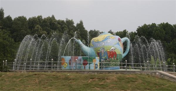 Bộ ấm trà gắn gốm trở thành Đài phun nước trang trí đồi chè Tân Cương
