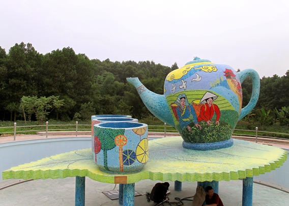 Các thành viên của công ty Nghệ Thuật Tân Hà Nội đã tạo hình và thi công bộ ấm trà gắn gốm này trong 3 tháng (từ tháng 8-10/2011). Bộ ấm trà được tạo hình bằng cốt bê tông và được trang trí bằng nghệ thuật gắn gốm Mosaic.