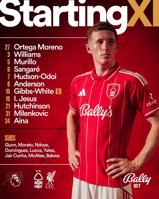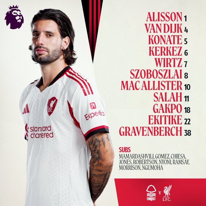 Liverpool: Alisson; Kerkez, Van Dijk, Konate, Szoboszlai; Mac Allister, Gravenberch; Gakpo, Wirtz, Salah; Ekitike.