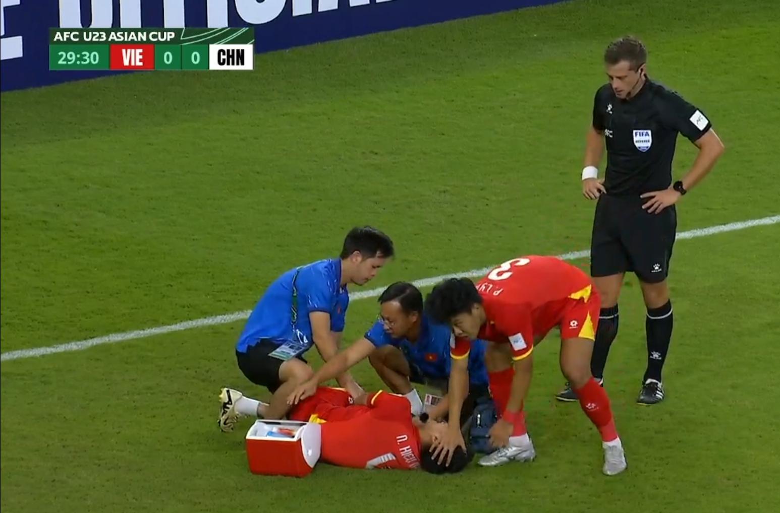 32': Hiểu Minh rời sân do chấn thương. Đây là tổn thất của U23 Việt Nam. HLV Kim Sang Sik tung Đức Anh vào sân thay thế.
