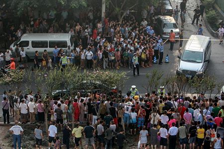Người dân đứng kín hai bên đường xem xác Zhou bị đưa đi.