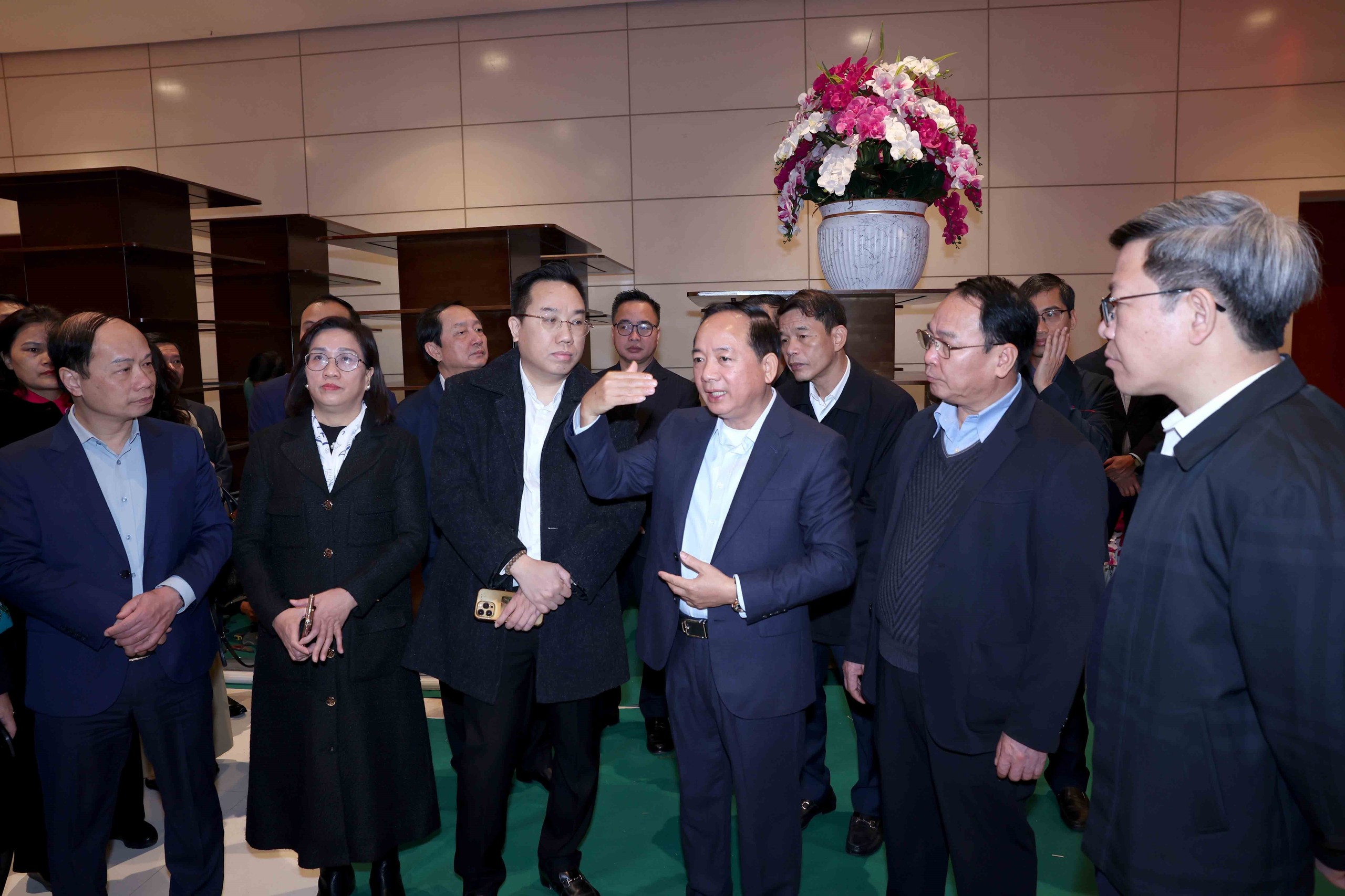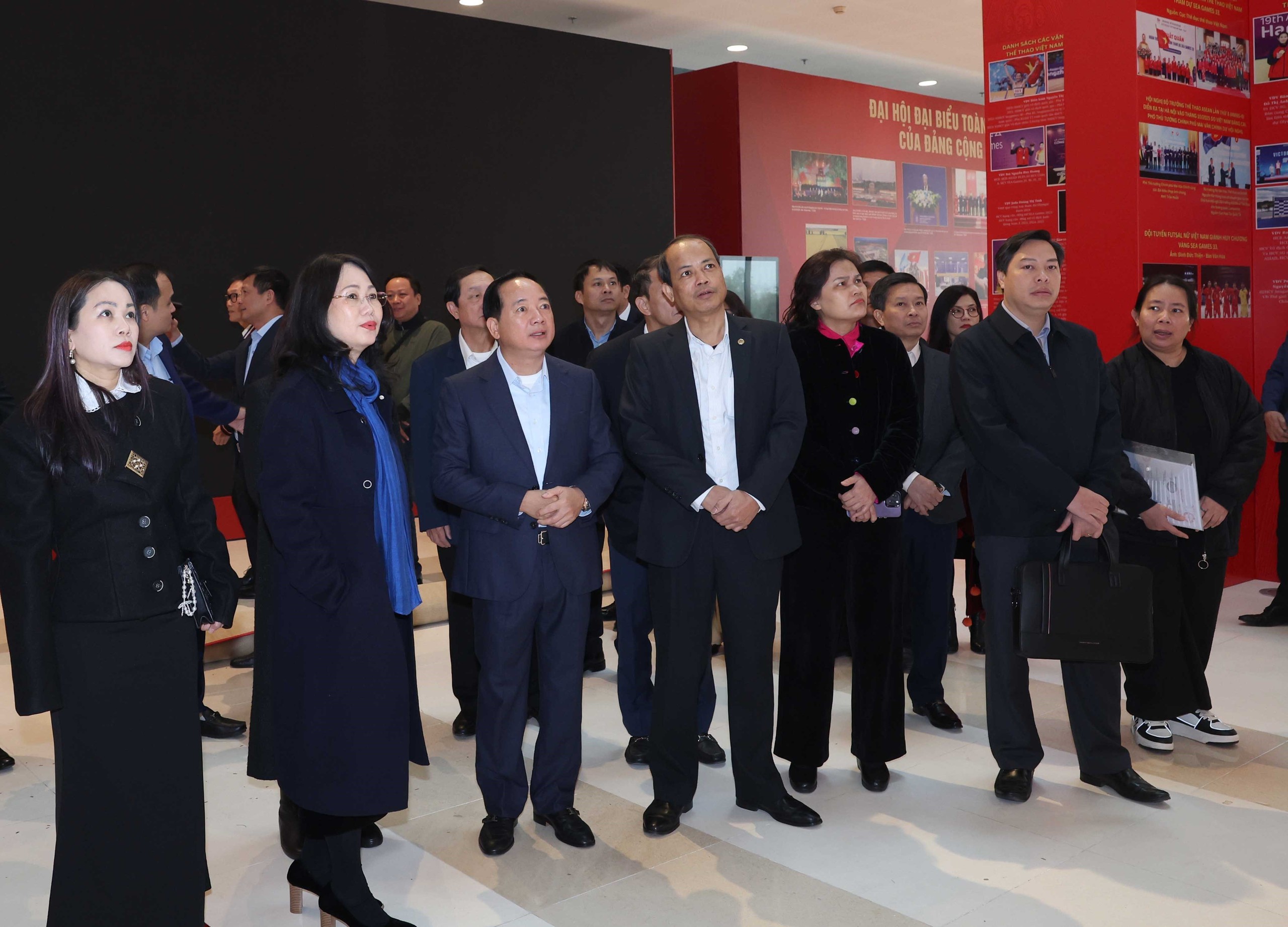 Trưởng Ban Tuyên giáo và Dân vận Trung ương Trịnh Văn Quyết kiểm tra khu trưng bày ảnh '"Dưới cờ Đảng - đất nước tiến vào kỷ nguyên mới" của Thông tấn xã Việt Nam. Ảnh: Phương Hoa - TTXVN