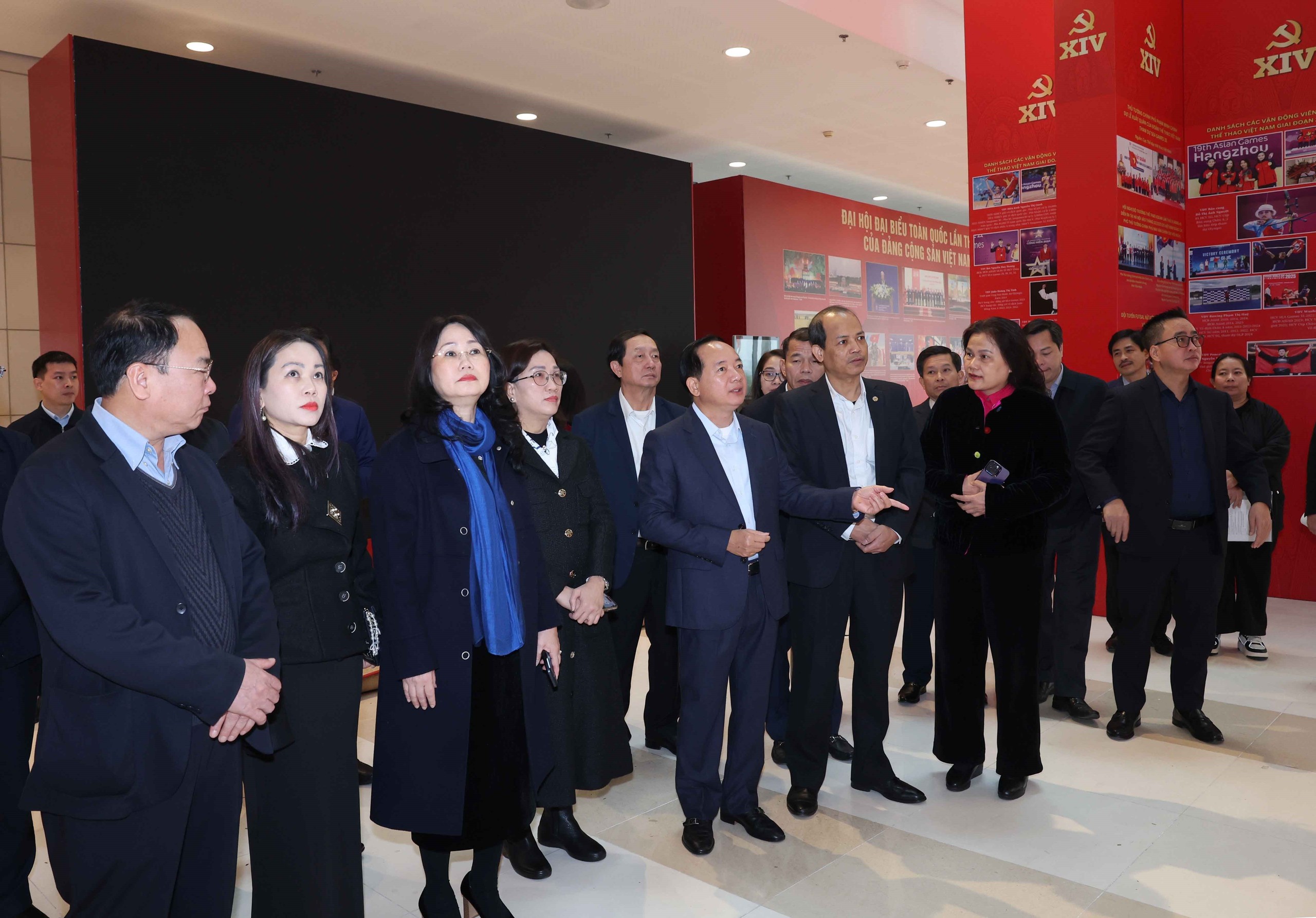 Trưởng Ban Tuyên giáo và Dân vận Trung ương Trịnh Văn Quyết kiểm tra khu trưng bày tại Đại hội XIV của Đảng. Ảnh: Phương Hoa - TTXVN