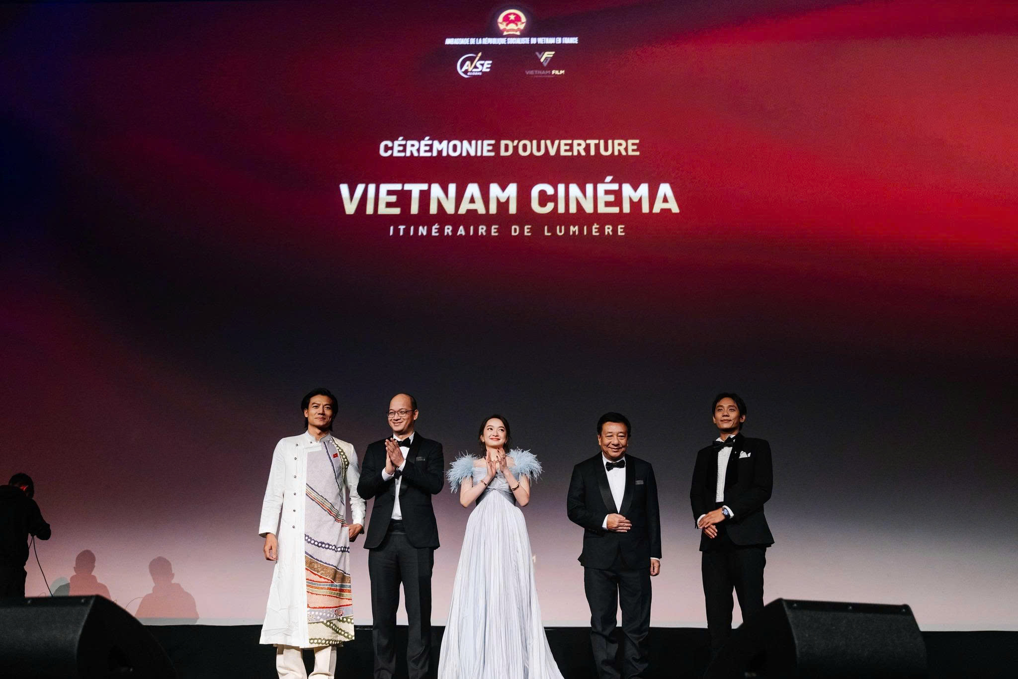 Đoàn phim "Tử chiến trên không" trên sân khấu chương trình Tuần lễ Điện ảnh Việt Nam - Hành trình Ánh sáng. Ảnh: VFDA