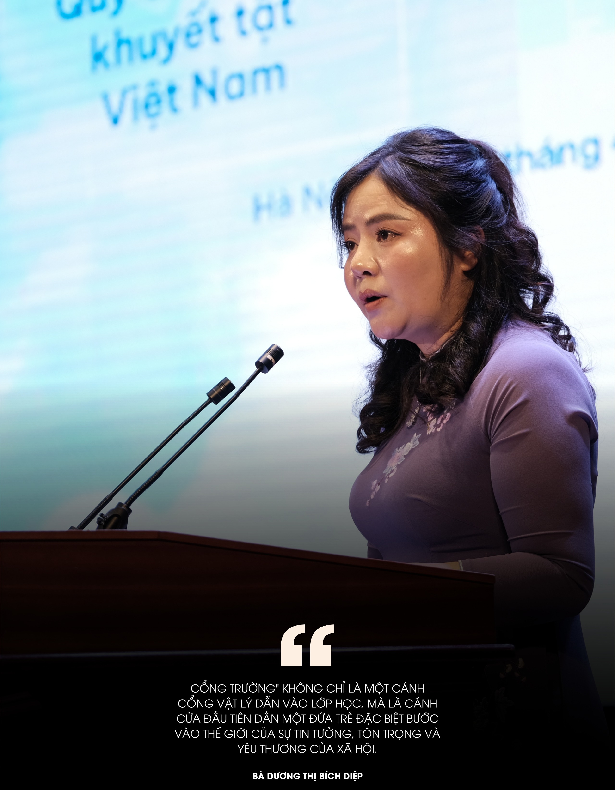 Bà Dương Thị Bích Diệp - Chủ tịch Quỹ Vì trẻ em khuyết tật Việt Nam chia sẻ: "Theo tôi, "cổng trường" không chỉ là một cánh cổng vật lý dẫn vào lớp học, mà là cánh cửa đầu tiên dẫn một đứa trẻ đặc biệt bước vào thế giới của sự tin tưởng, tôn trọng và yêu thương của xã hội".