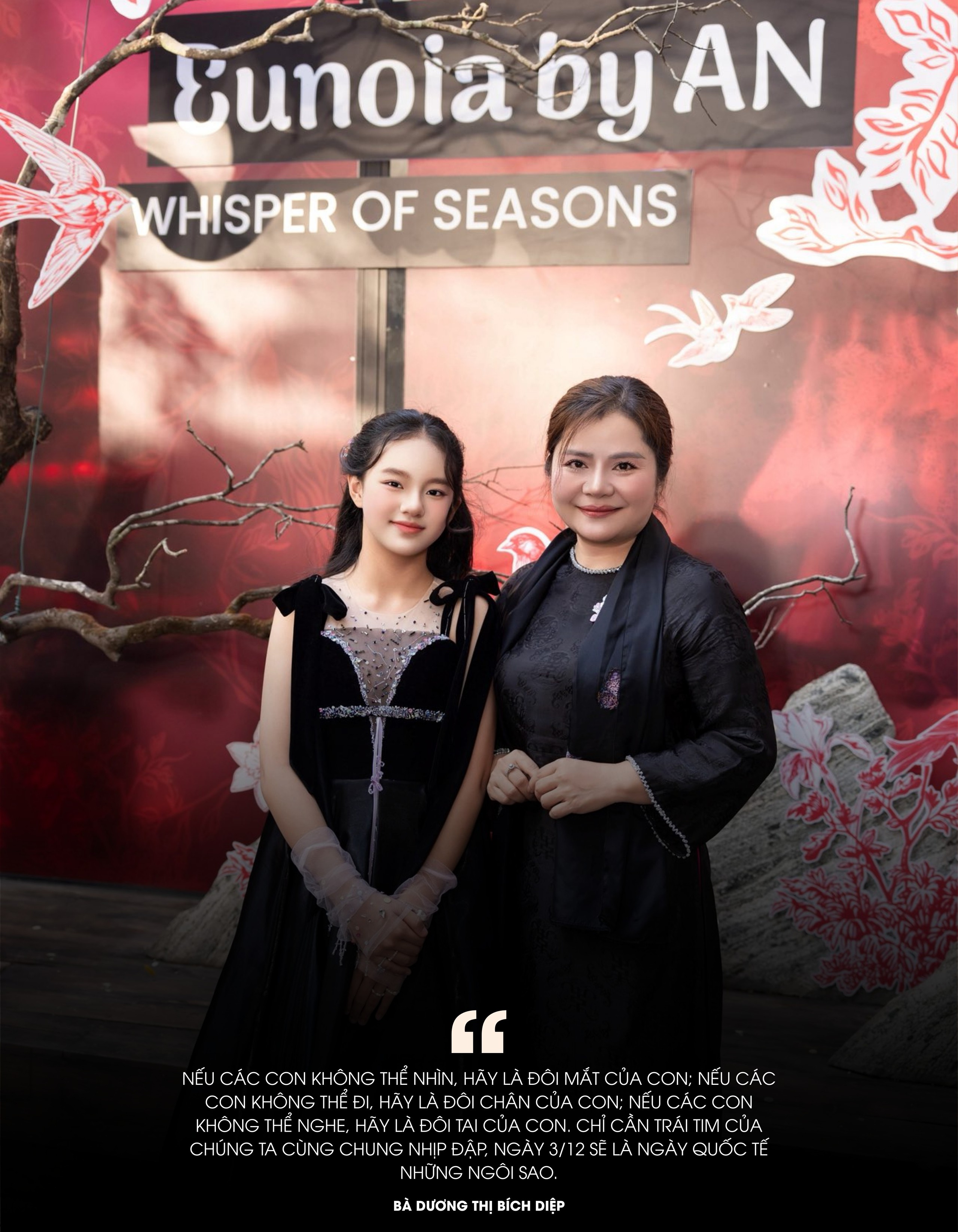 Gia Hân – cô bé khiếm thính vượt lên giới hạn để trở thành người mẫu nhí truyền cảm hứng - xuất hiện rạng rỡ bên bà Dương Thị Bích Diệp, Chủ tịch Quỹ Vì trẻ em khuyết tật Việt Nam, tại show thời trang Eunoia by AN
