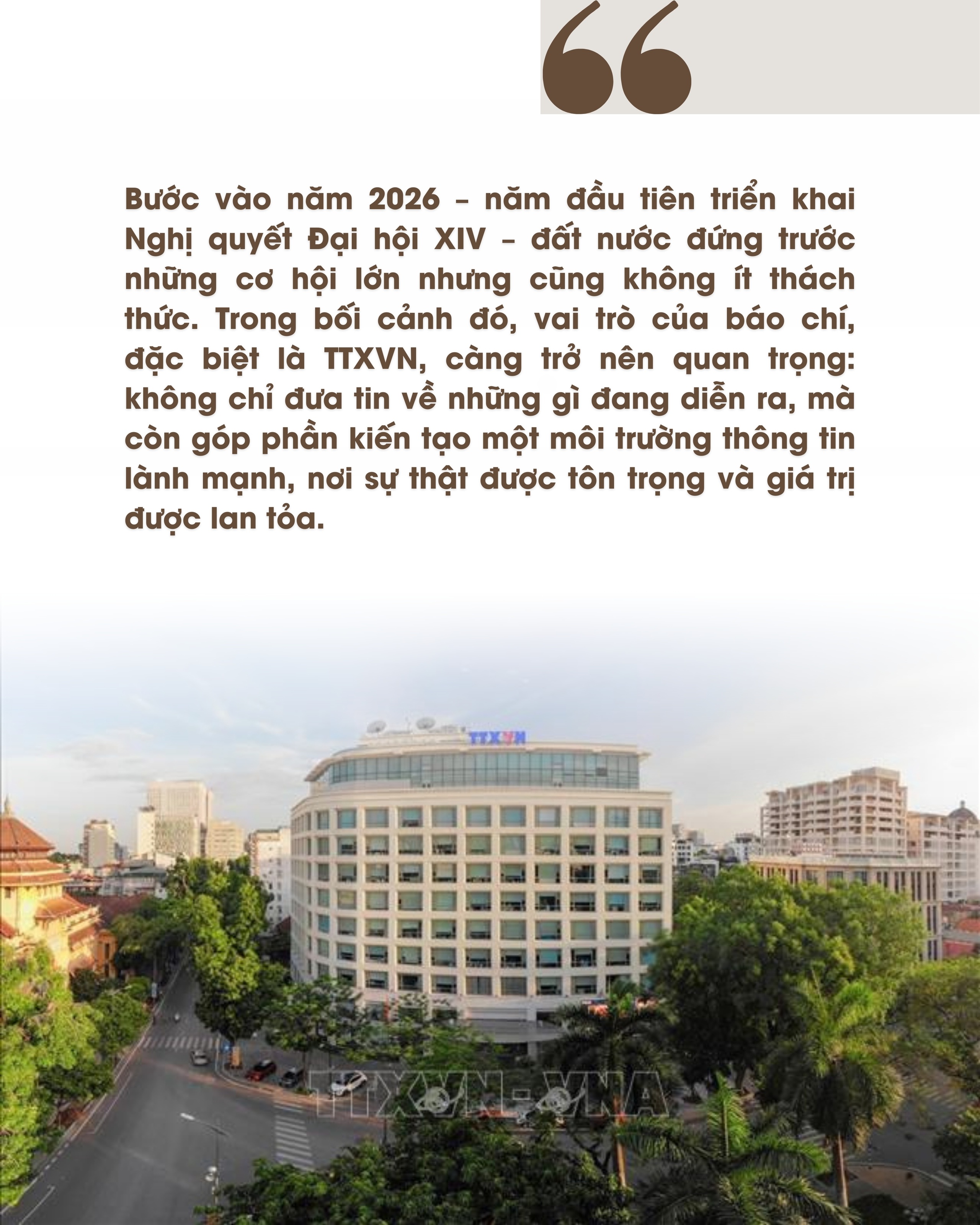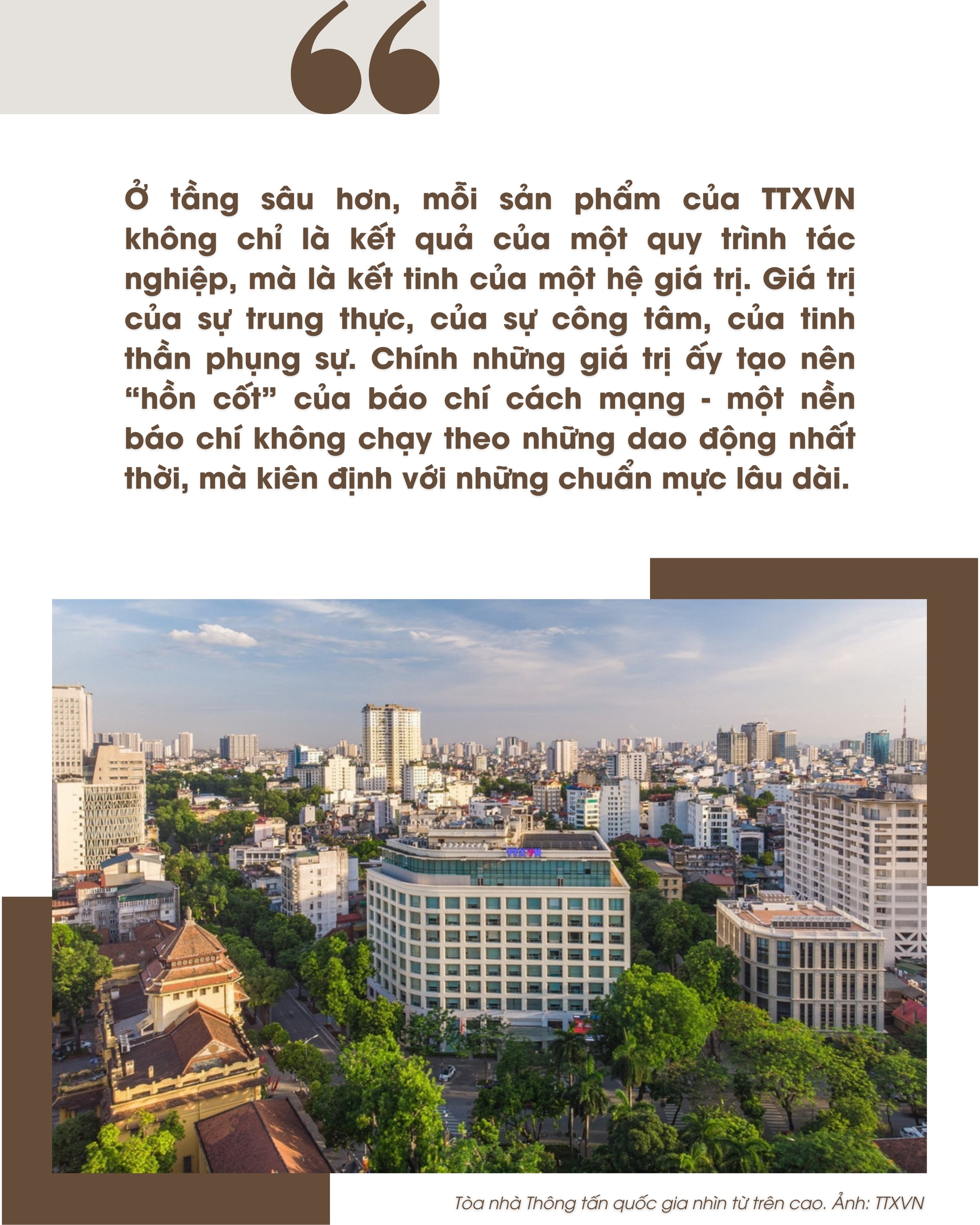 Chính ở điểm này, vai trò của TTXVN vượt lên khuôn khổ của một cơ quan báo chí thông thường. Là "ngân hàng tin" của Chính phủ, là cầu nối giữa Đảng với Nhân dân và giữa Nhân dân với Đảng, TTXVN không chỉ cung cấp thông tin, mà còn góp phần định hình không gian tinh thần của xã hội. Mỗi bản tin, mỗi bức ảnh, mỗi sản phẩm báo chí vì thế đều mang một trọng trách lớn hơn: giữ cho dòng chảy thông tin được trong sáng, chuẩn mực và đáng tin cậy.