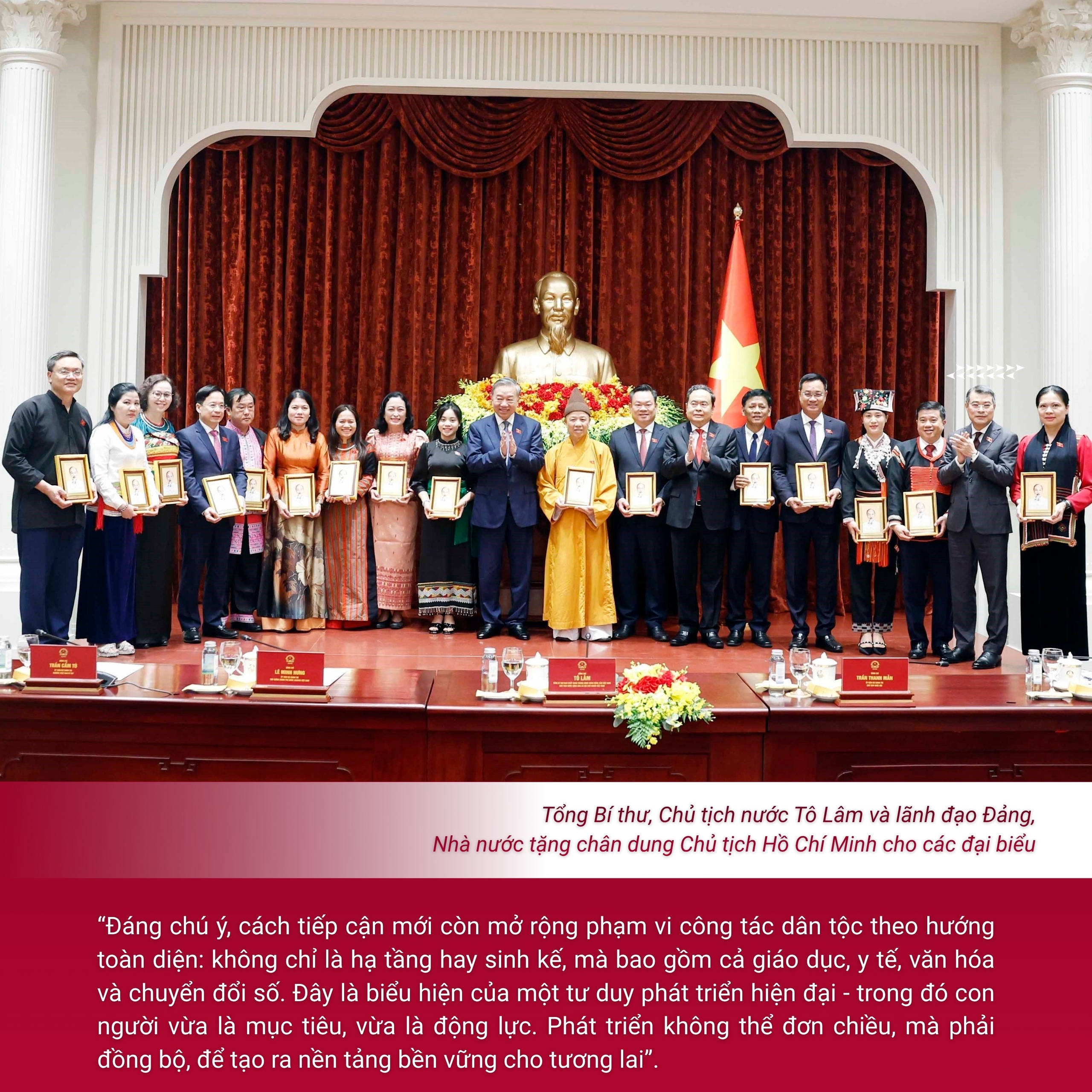 Công tác dân tộc, trong cách tiếp cận mới ấy, không còn là một lĩnh vực riêng biệt, mà phải được đặt trong tổng thể chiến lược phát triển quốc gia. Mỗi quyết sách về hạ tầng, giáo dục, y tế, chuyển đổi số hay văn hóa đều phải tính đến đặc thù của vùng đồng bào dân tộc thiểu số. Phát triển, vì thế, không chỉ là tăng trưởng, mà là bảo đảm không ai bị bỏ lại phía sau - một biểu hiện cụ thể của tư tưởng "dân là gốc" trong điều kiện mới.