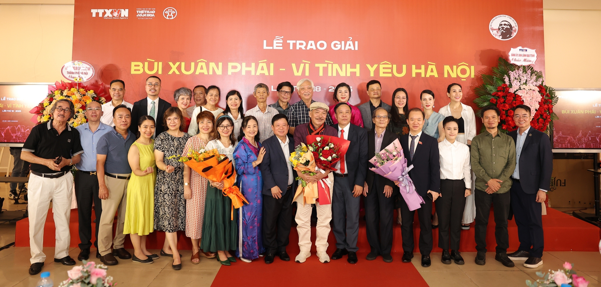 BTC, Hội đồng giám khảo cùng các chủ nhân Giải thưởng Bùi Xuân Phái - Vì tình yêu Hà Nội lần 18 - 2025 chụp ảnh chung tại Lễ trao giải diễn ra tối ngày 3/10 vừa qua