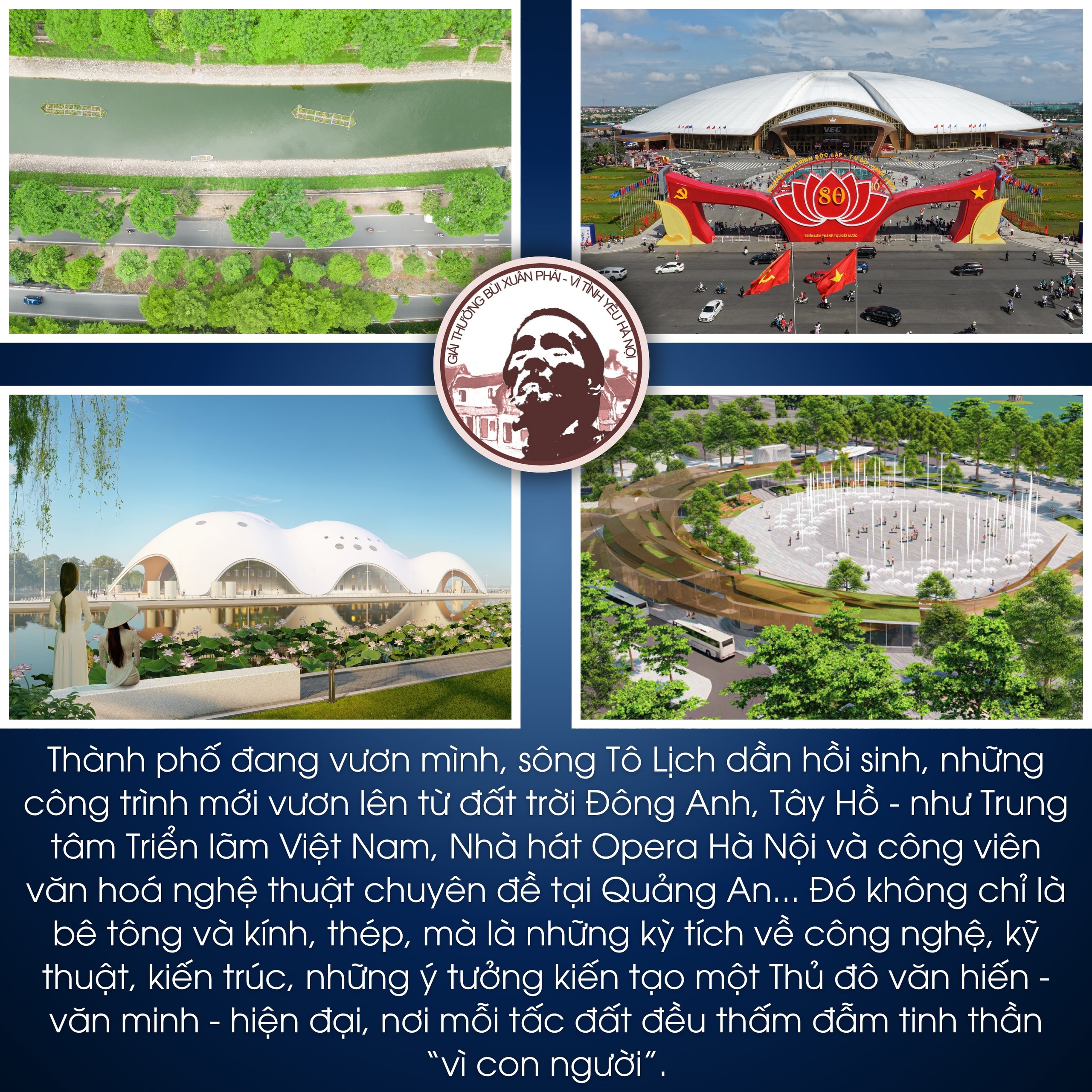 Thành phố đang vươn mình, sông Tô Lịch dần hồi sinh, những công trình mới vươn lên từ đất trời Đông Anh, Tây Hồ – như Trung tâm Triển lãm Việt Nam, Nhà hát Opera Hà Nội và công viên văn hoá nghệ thuật chuyên đề tại Quảng An... Đó không chỉ là bê tông và kính, thép, mà là những kỳ tích về công nghệ, kỹ thuật, kiến trúc, những ý tưởng kiến tạo một Thủ đô văn hiến – văn minh – hiện đại, nơi mỗi tấc đất đều thấm đẫm tinh thần "vì con người".