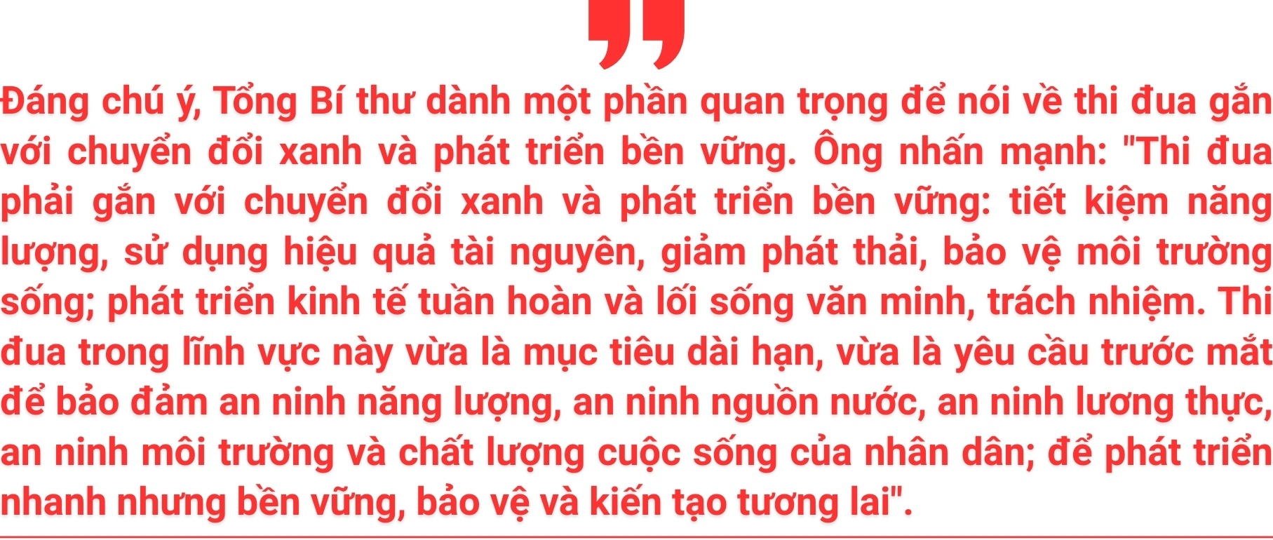 Không chỉ dừng lại ở truyền thống, Tổng Bí thư coi thi đua yêu nước trong giai đoạn mới phải trở thành "một hệ sinh thái năng động" để mọi chủ trương đúng đắn được chuyển hóa thành hành động thiết thực. Khái niệm "hệ sinh thái" thường dùng trong kinh tế, công nghệ, nay được đưa vào thi đua là một gợi ý rất đáng chú ý. Nó cho thấy thi đua không còn là những đợt vận động rời rạc, mang tính phong trào, mà là một môi trường sống, một không gian văn hóa bao quanh mỗi người, mỗi tập thể.