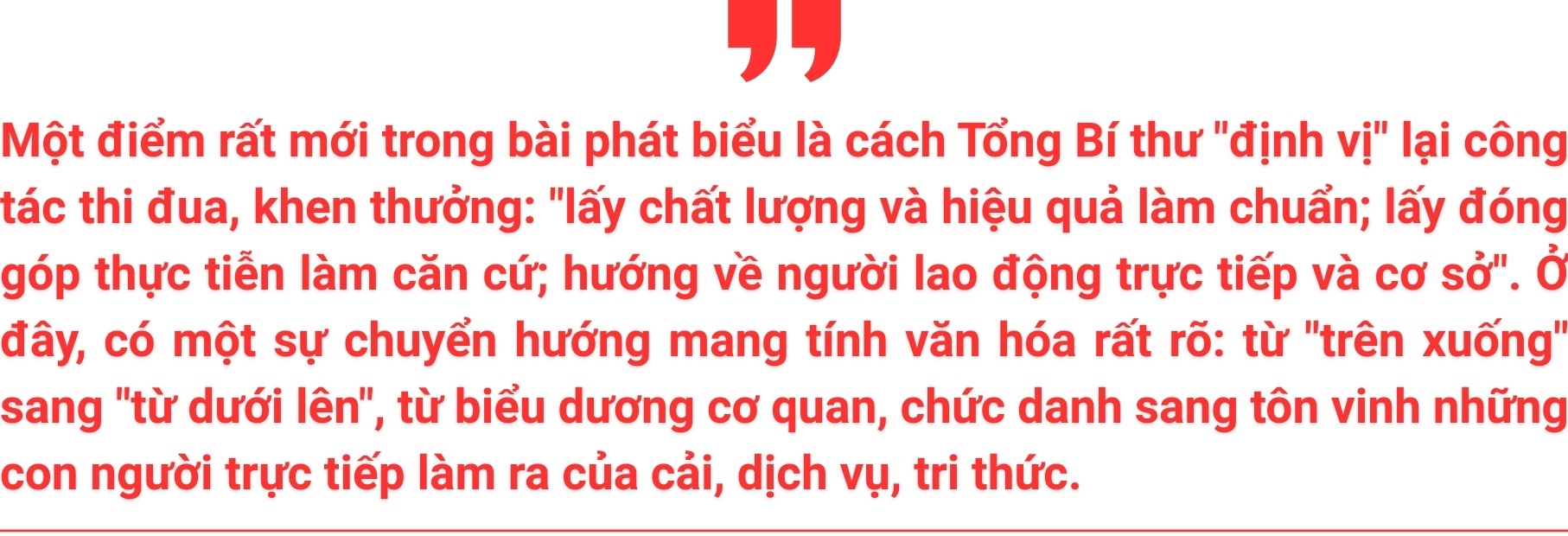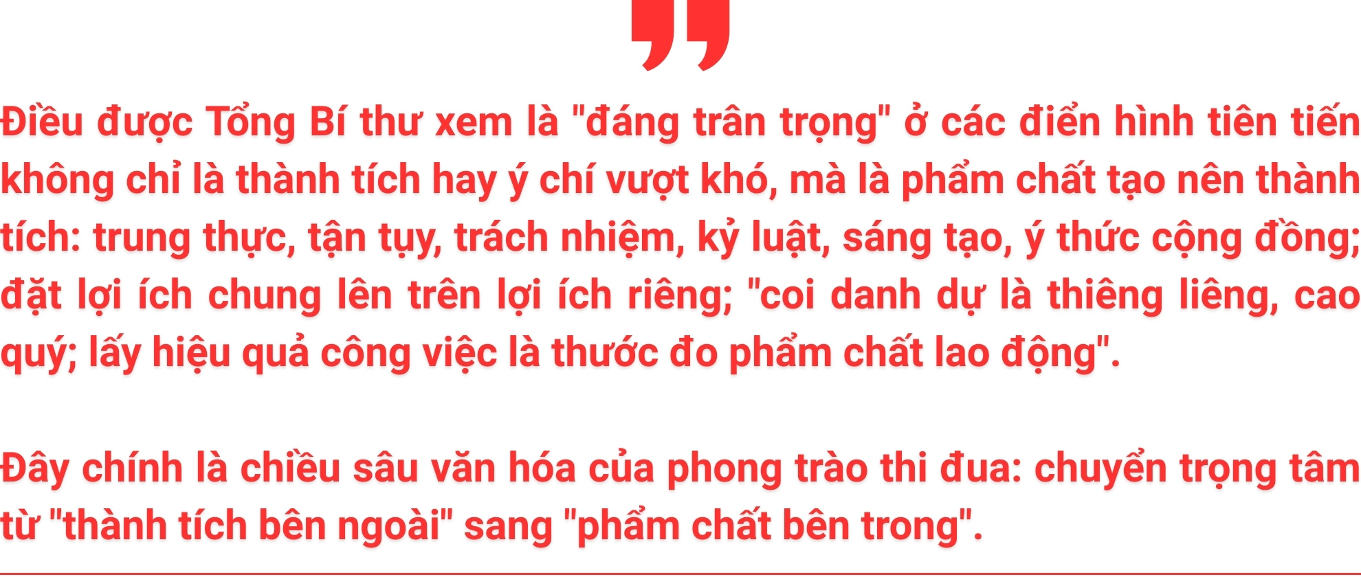 Vượt lên trên những con số thành tích, giá trị cốt lõi của thi đua được Tổng Bí thư nhấn mạnh: thi đua để sống tốt hơn, đẹp hơn và nghĩa tình hơn, làm sáng rõ chân lý "người với người sống để yêu nhau".