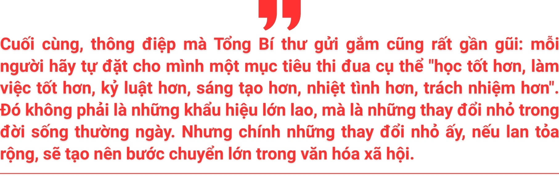 Khi thi đua được hiểu như một cách sống tử tế, có trách nhiệm, giàu nhân ái, thì mỗi bước tiến của mỗi cá nhân sẽ góp phần đẩy đất nước đi lên - vừa vững vàng về kinh tế, vừa sâu sắc về văn hóa.