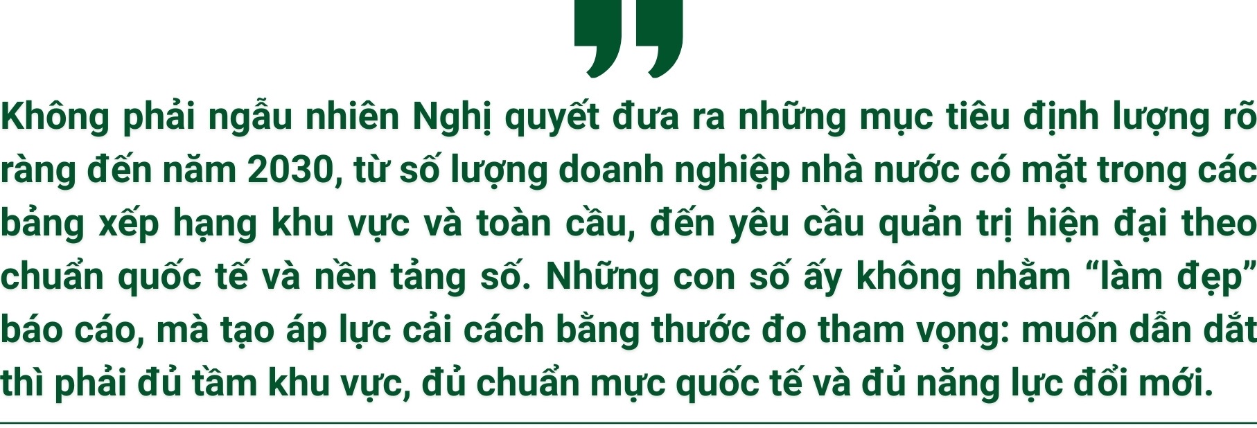 Từ sự nhận diện ấy, Nghị quyết đặt ra một chuyển dịch tư duy quan trọng: kinh tế nhà nước vẫn giữ vai trò chủ đạo để bảo đảm ổn định vĩ mô, các cân đối lớn của nền kinh tế, quốc phòng – an ninh và khả năng can thiệp kịp thời trước những tình huống đột xuất. Nhưng "chủ đạo" không còn là một vị thế đứng ngoài thước đo, mà phải được chứng minh bằng hiệu quả thực chất, bằng năng lực dẫn dắt và bằng khả năng mở đường cho các khu vực kinh tế khác cùng phát triển.