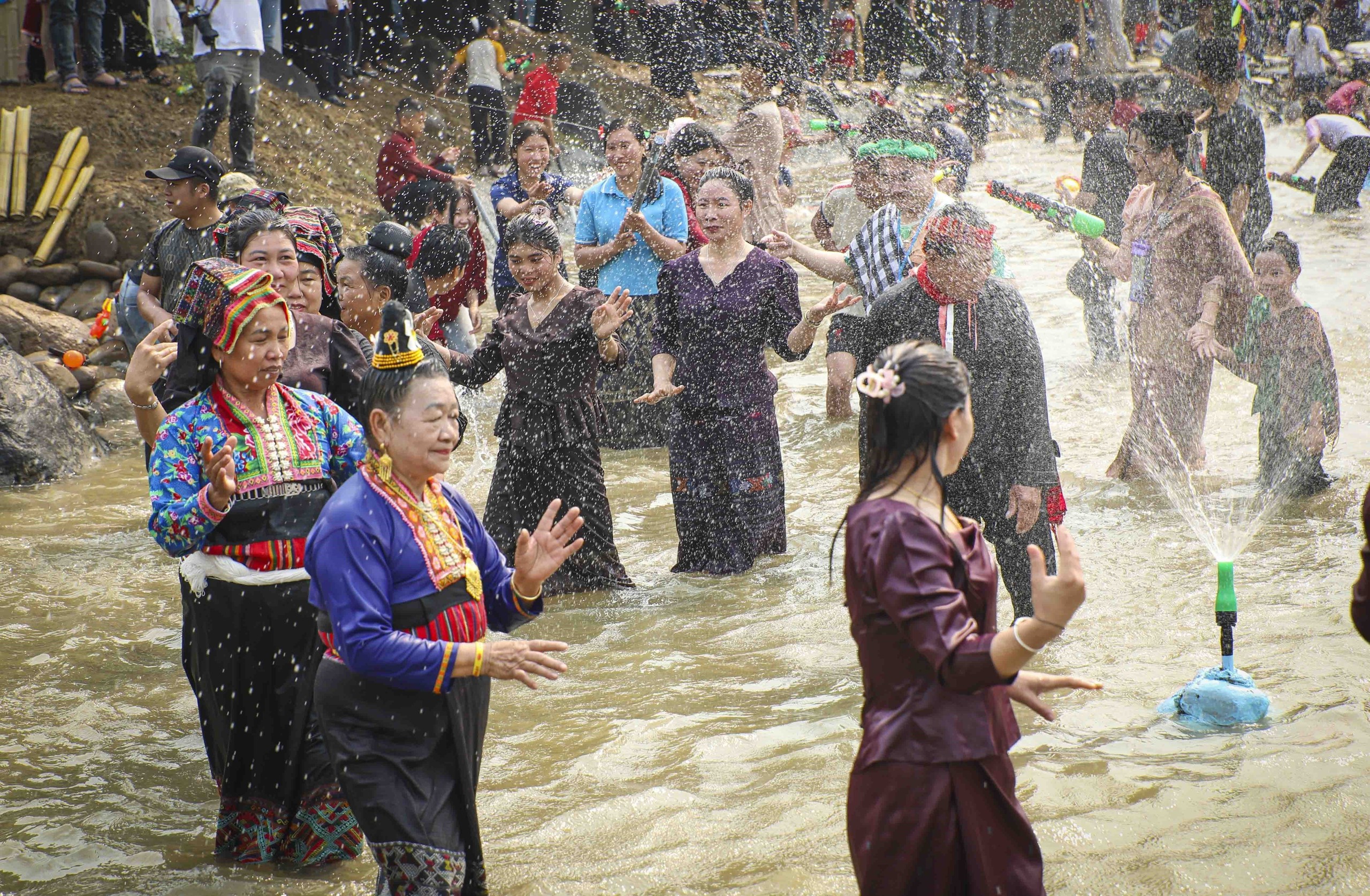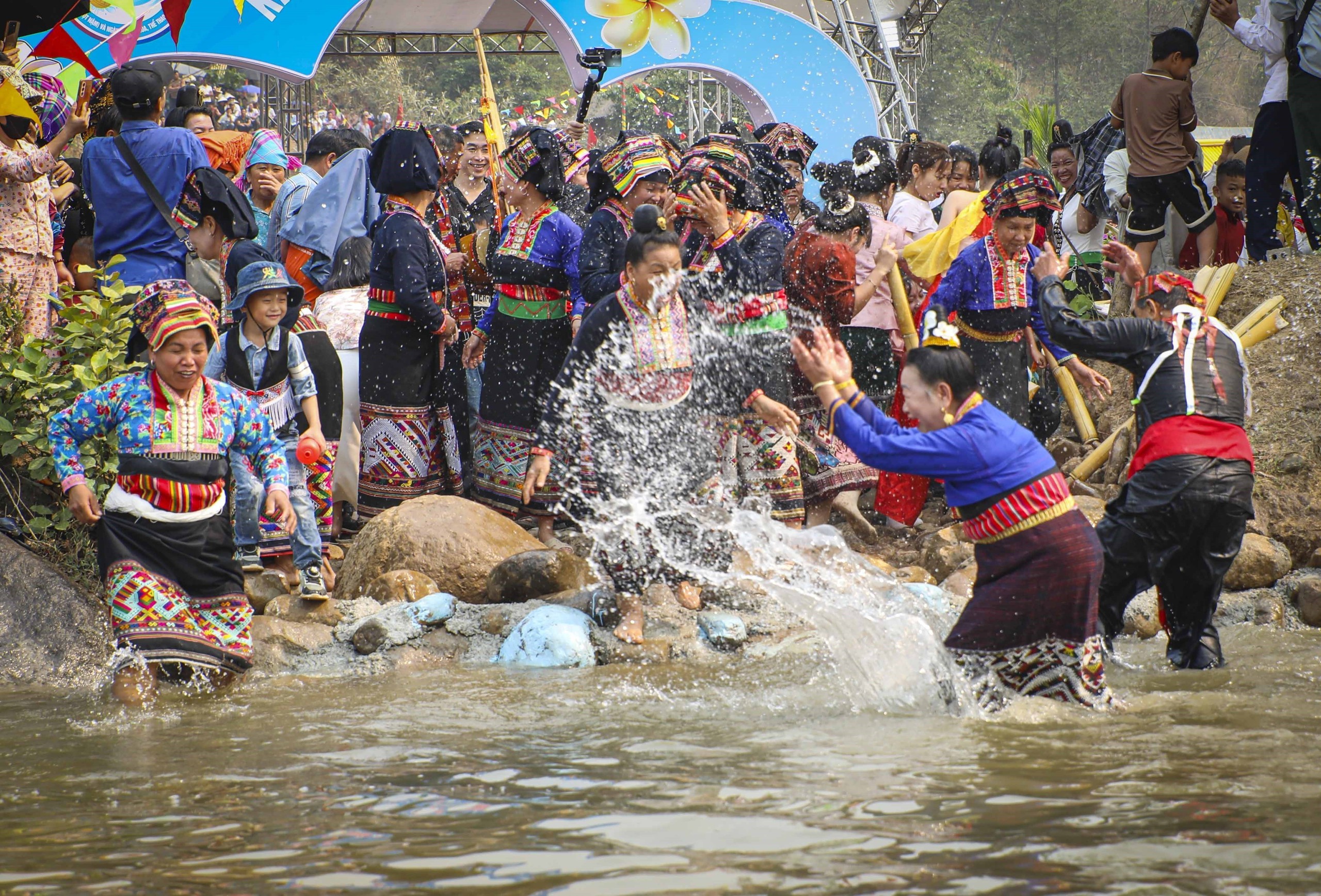 Người dân và du khách hòa mình vào hoạt động té nước sôi động tại Lễ hội Tết Té nước ở xã Núa Ngam, tỉnh Điện Biên