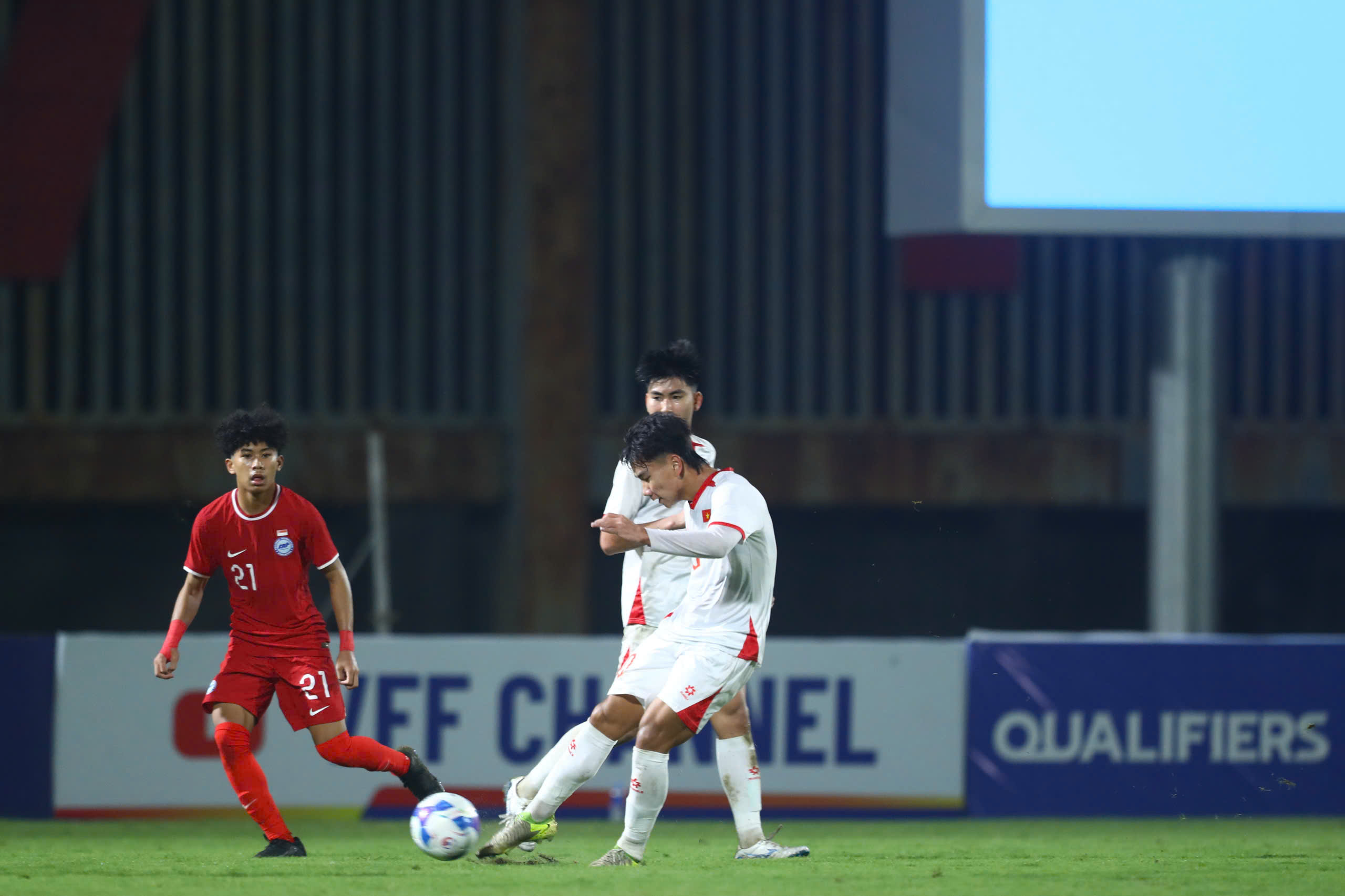 55': U17 Việt Nam vẫn duy trì được sức ép lên phần sân đối phương. Các pha lên bóng của U17 Singapore nhanh chóng bị các học trò của HLV Roland hóa giải.