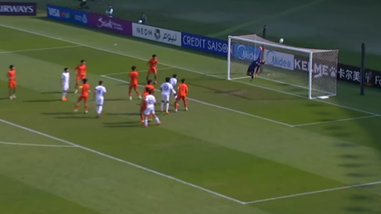 Phút 82: KHÔNG VÀO! Thủ thành Li Hao cản phá tốt và anh đã bị cầu thủ Uzbekistan phạm lỗi trong vòng cấm.