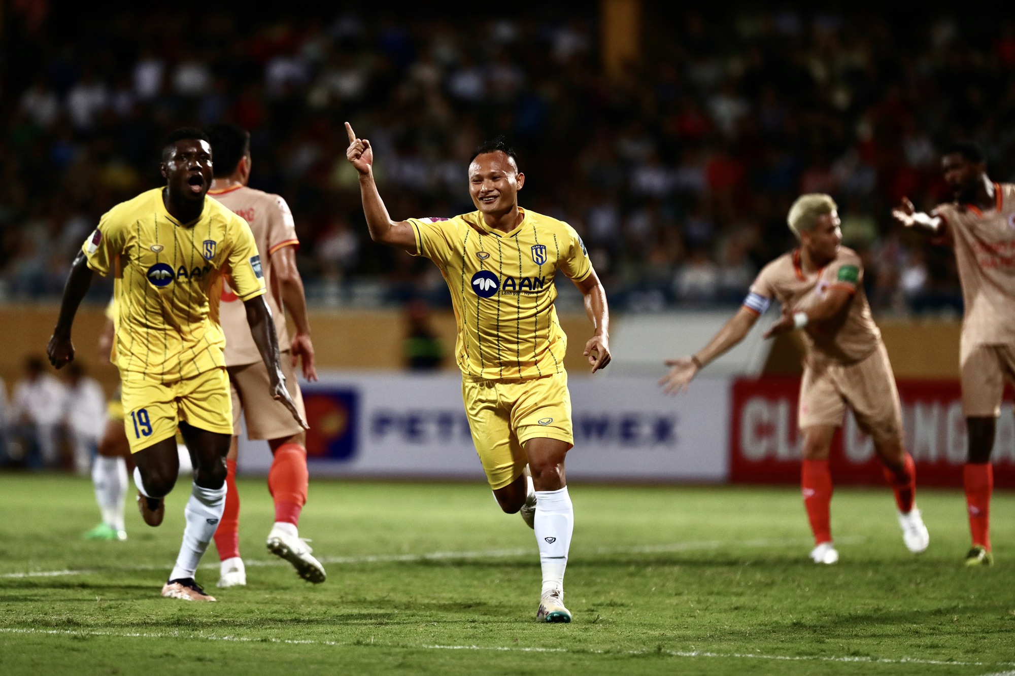 Hậu vệ Đoàn Văn Hậu đã có tình huống tranh đá phạt đền với ngoại binh Jhon Cley trong trận đấu giữa CAHN và SLNA.