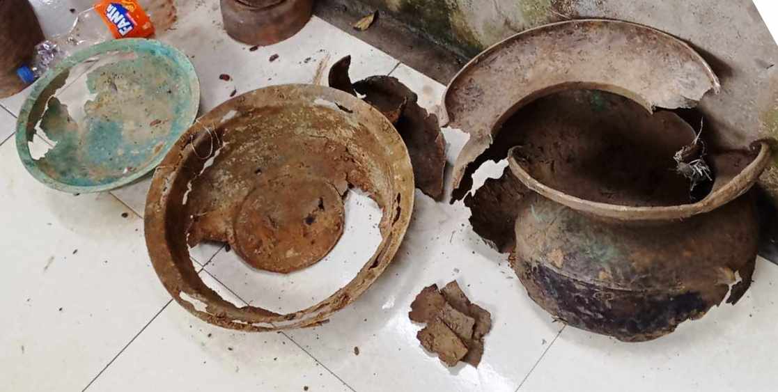 Thanh kiếm mới khai quật ở Lương Nội, Bá Thước, Thanh Hóa cùng nồi mâm, bát đồng và vòng tai đá, thủy tinh, chuỗi mã não (ảnh do chủ nhân cung cấp)