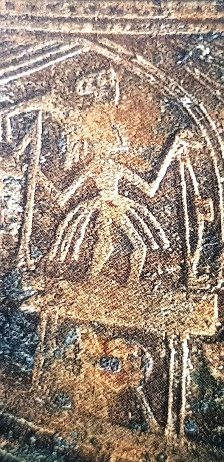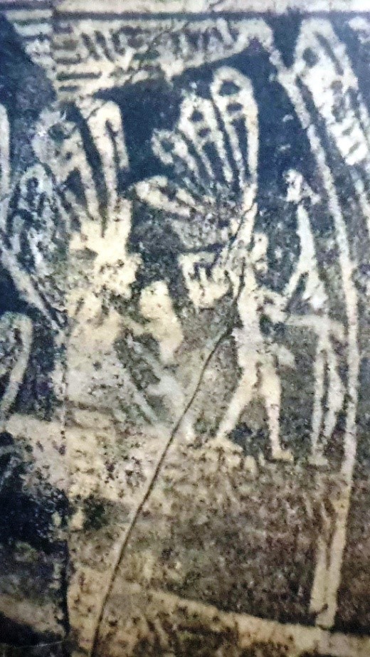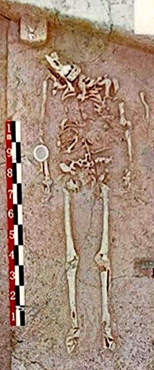 Hình trái và phải: đặc tả chiến binh Đông Sơn đứng trên sạp lầu thuyền tay cầm cung nỏ và mũi tên (thuyền khắc trên thạp đồng Đông Sơn thuộc sưu tập các bảo tàng Barbier-Mueller và Yên Bái cũ). Hình chính giữa là hài cốt chiến binh 3.500 năm trước mang theo chiếc cung/nỏ đã tan trong đất và bó mũi tên hiện còn bên cạnh thái dương. Ảnh: Viện Khảo cổ học