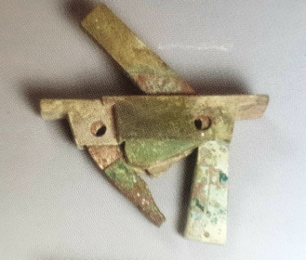Hình trái và phải: Hai lẫy nỏ Giao Chỉ gồm 6 bộ phận bằng đồng phát hiện ở Việt Nam (sưu tập CQK, California, Mỹ). Hình giữa: Phần gỗ ốp sơn then ốp chặt phần lẫy nỏ bằng đồng nối với phần rãnh đặt mũi tên (hiện vật trưng bày tại Bảo tàng Cernuschi, Paris, Pháp)