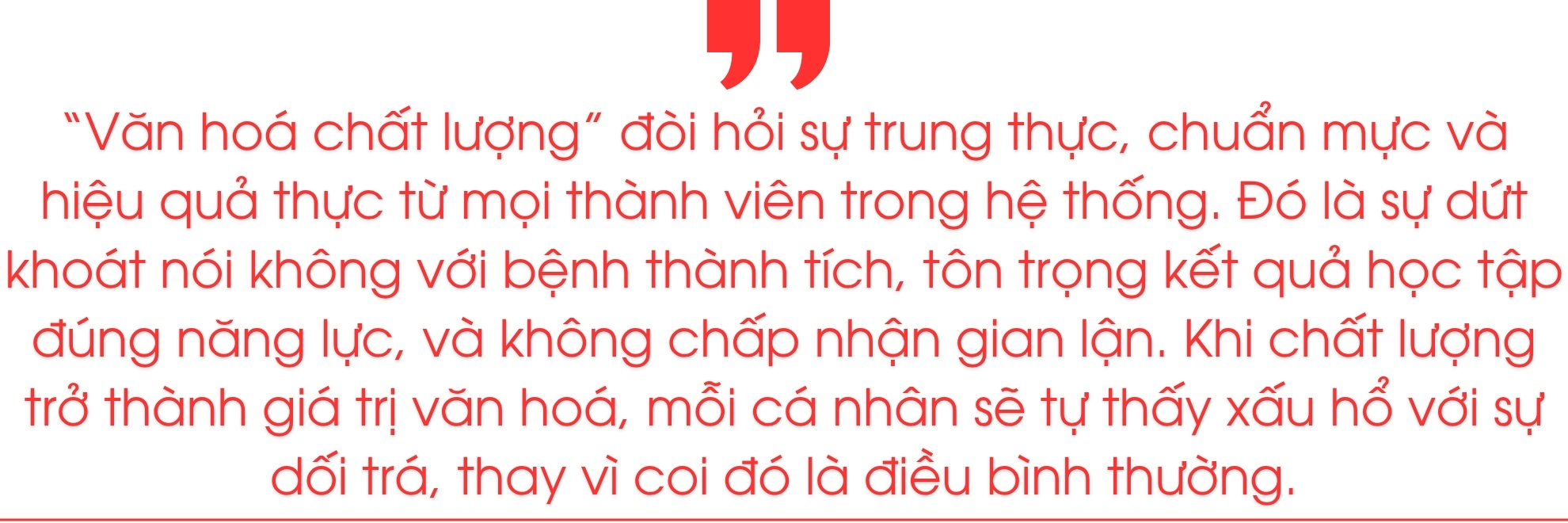 "Văn hoá chất lượng" đòi hỏi sự trung thực, chuẩn mực và hiệu quả thực từ mọi thành viên trong hệ thống. Đó là sự dứt khoát nói không với bệnh thành tích, tôn trọng kết quả học tập đúng năng lực, và không chấp nhận gian lận. Khi chất lượng trở thành giá trị văn hoá, mỗi cá nhân sẽ tự thấy xấu hổ với sự dối trá, thay vì coi đó là điều bình thường.