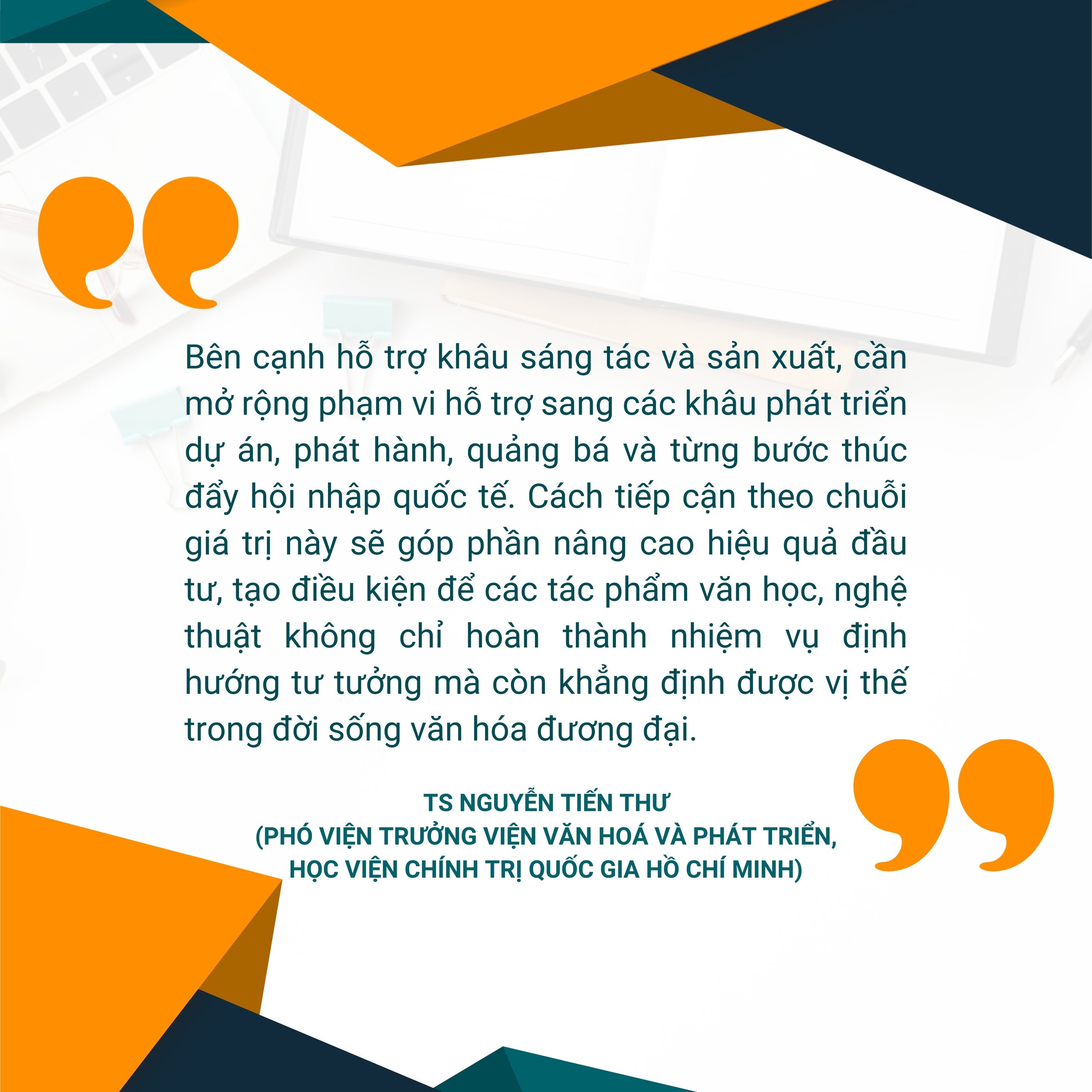 Để tạo điều kiện cho sự ra đời của các tác phẩm vừa đúng định hướng, vừa có chất lượng nghệ thuật cao và khả năng cạnh tranh trên thị trường, theo ông Thư, cơ chế đặt hàng và hỗ trợ sáng tác cần được đổi mới theo hướng chuyên nghiệp, minh bạch và hiệu quả hơn.