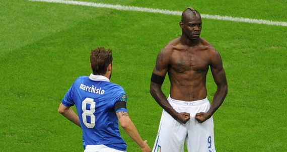 Là cầu thủ da màu đầu tiên khoác áo ĐTQG Ý, trong những trận đấu đầu tiên, Balotelli được “chào đón” bằng những tiếng giả khỉ hú, những lời lẽ nặng nề mang phong cách Ý bảo thủ: “Làm gì có người Ý da đen!”. Balotelli, một người gốc Ghana, sinh ra trên mảnh đất hình chiếc ủng và chưa bao giờ đặt chân tới châu Phi. Sự phân biệt chủng tộc vẫn tiếp diễn, mặc cho những bàn thắng nối tiếp nhau trong màu áo thiên thanh của anh. Trước khi Ý đối đầu với Anh trong khuôn khổ EURO 2012, tờ nhật báo Gazzetta dello Sport đã đăng một bức biếm họa mà trong đó Balotelli là chú King Kong gào rú trên đỉnh Big Ben. Trước những lời chỉ trích, Gazzetta đã phải tuyên bố: “Chúng tôi đấu tranh chống nạn phân biệt chủng tộc trên mọi sân cỏ”. Người Ý không mù màu, nhưng nền văn hóa cổ điển của họ không có chút tôn trọng nào dành cho người da màu. Sau khi ghi 2 bàn vào lưới Đức ở trận Bán kết cũng trong giải này, một tòa soạn có tiếng khác là Tuttosport ăn mừng chiến thắng bằng tiêu đề LI ABBIAMO FATTI NERI, tạm dịch là “Phủ màn đen lên mắt đối thủ” – Cái tít mang sắc thái đụng chạm đến vấn đề nhạy cảm kể trên.